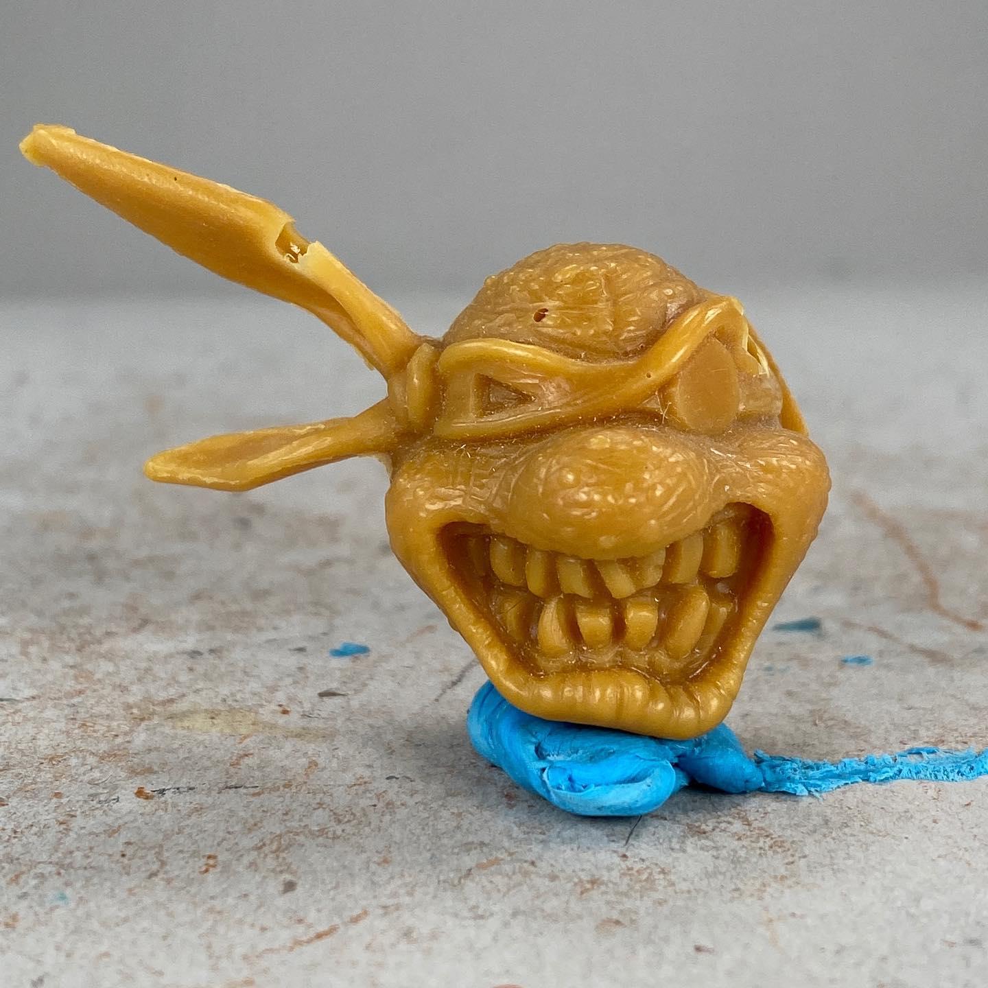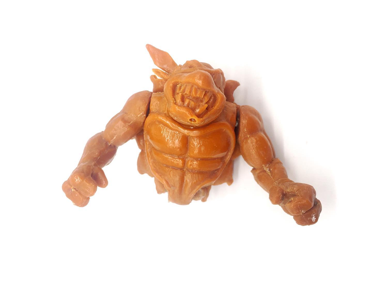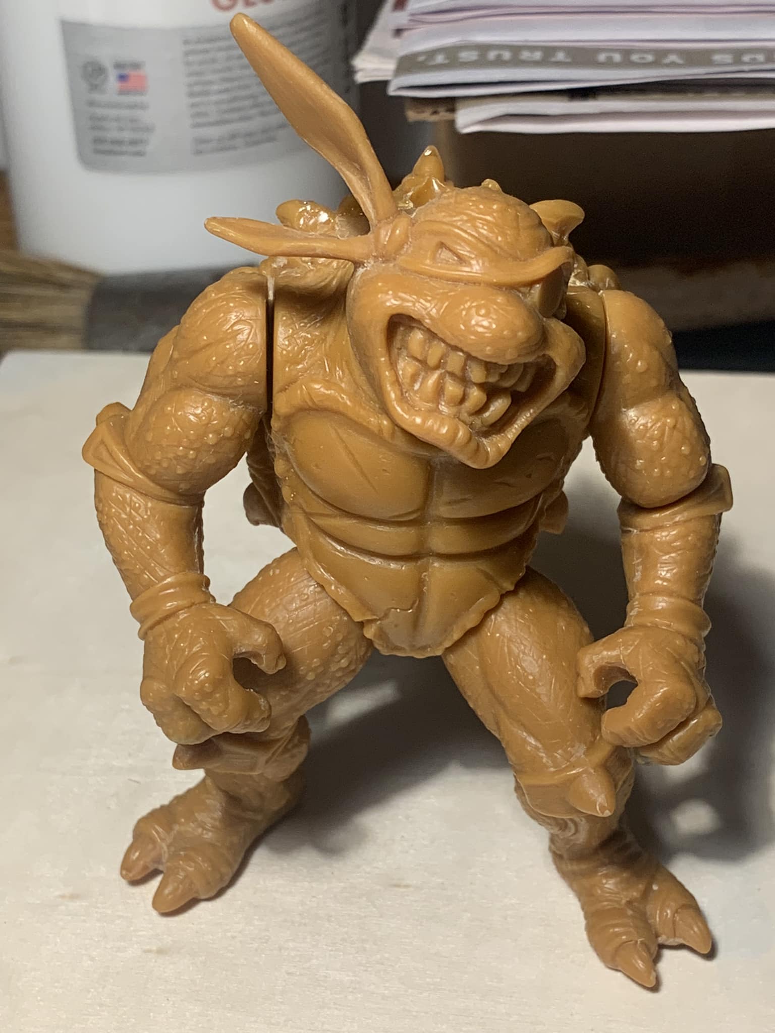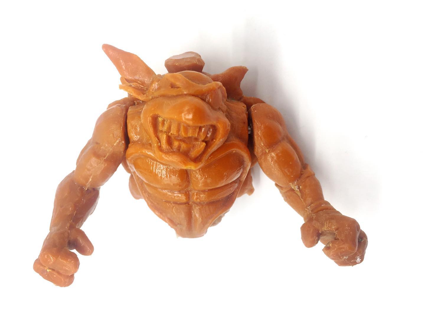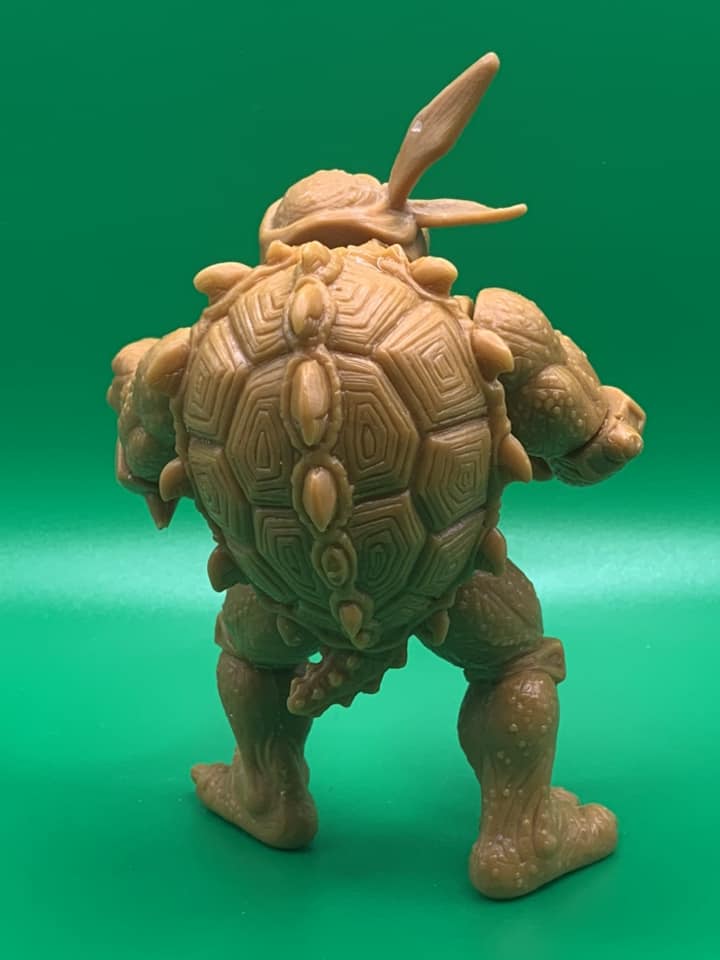 De la même manière, nous ne possédons que trop peu de travaux préliminaires et surtout des hypothèses. Le collectionneur Matt George a présenté notamment une partie d’une hard copy très peu détaillée de la figurine de Slash (Fig. 1 à 3). Celle-ci était plus massive que la version finale, notamment au niveau de la carapace, plus imposante. Les épaules étaient plus larges également. L’état peu avancé des détails laisse à penser qu’il s’agissait d’un essai pour voir si la figurine pouvait ou non être commercialisée dans un blister classique, au vu de ses dimensions particulières.