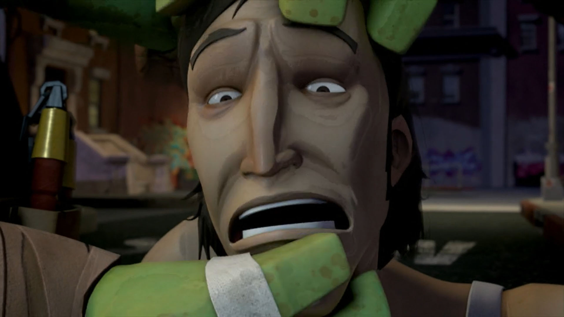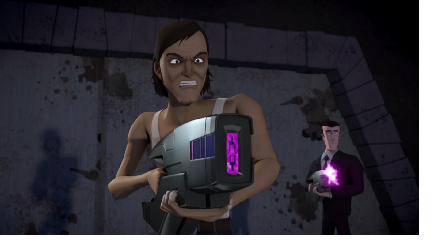 Après avoir découvert l’existence des extraterrestres, Michelangelo voulut prouver ses dires à ses frères en démasquant le malfrat. Il se rendit compte qu’il s’agissait bien d’un humain.