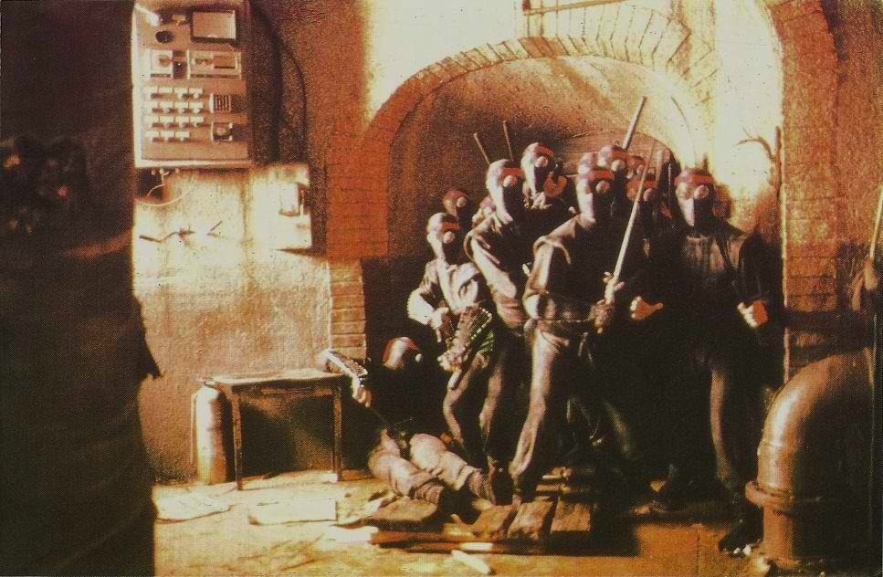 - Ces ninjas Foot sont très différents de ce que l’on pouvait observer, à la même époque, à travers le dessin animé. En effet, Steve Barron tenait à suivre les grandes lignes du comic originel en présentant de vrais ninjas. Afin de les rendre plus discrets dans la nuit, il fut décidé de les affubler d’une tenue sombre, et non rouge ou rosée comme dans ce qui était connu à ce moment dans le comic.