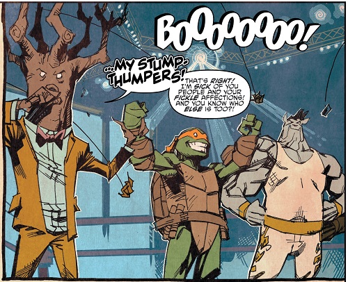 L’arbre avait vendu tout le bois de sa planète à Krang contre une petite fortune qui lui permit d’ouvrir son propre astéroïde dédié au catch. Il y devenait à la fois organisateur de combat et commentateur sportif avec son semblable Sling. Il était l’un des cinq témoins au procès de l’utrom. Les tortues durent donc partir à son secours avant qu’il ne se fasse tuer par Hakk-R afin d’assurer l’innocence du général utrom.