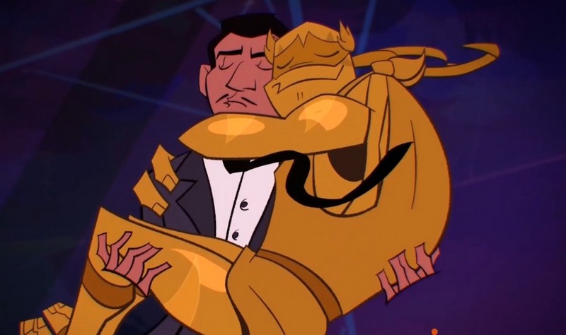- Sur Twitter, le scénariste Russ Carney a révélé un extrait de la deuxième ébauche du script de l’épisode The Hidden city job, au moment où Hueso et Piel fusionnent en don Suave. Ce nouveau personnage est un hommage au sex-symbol latino du cinéma des années 50’-60’ de Russ Carney, Ricardo Montalbán.