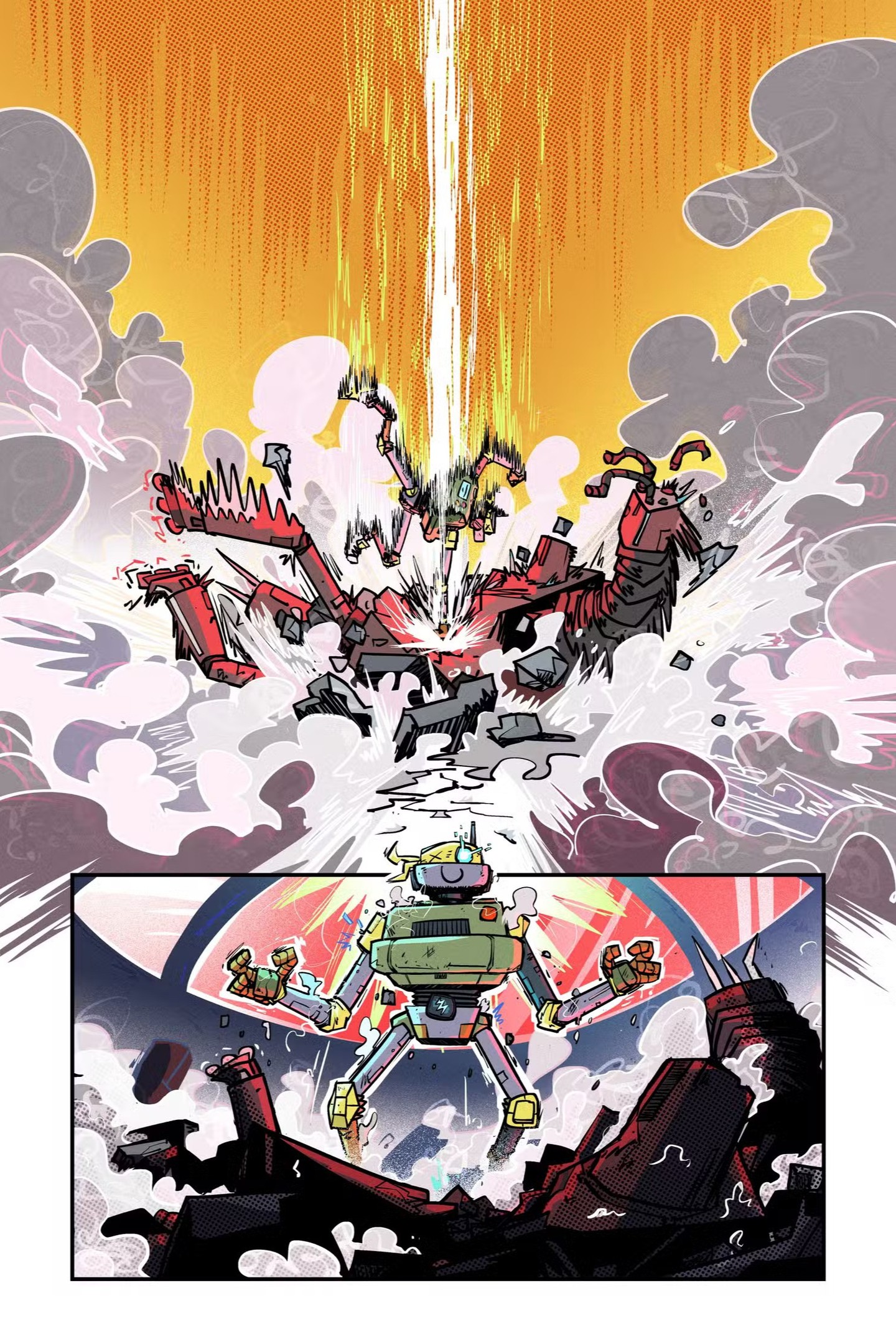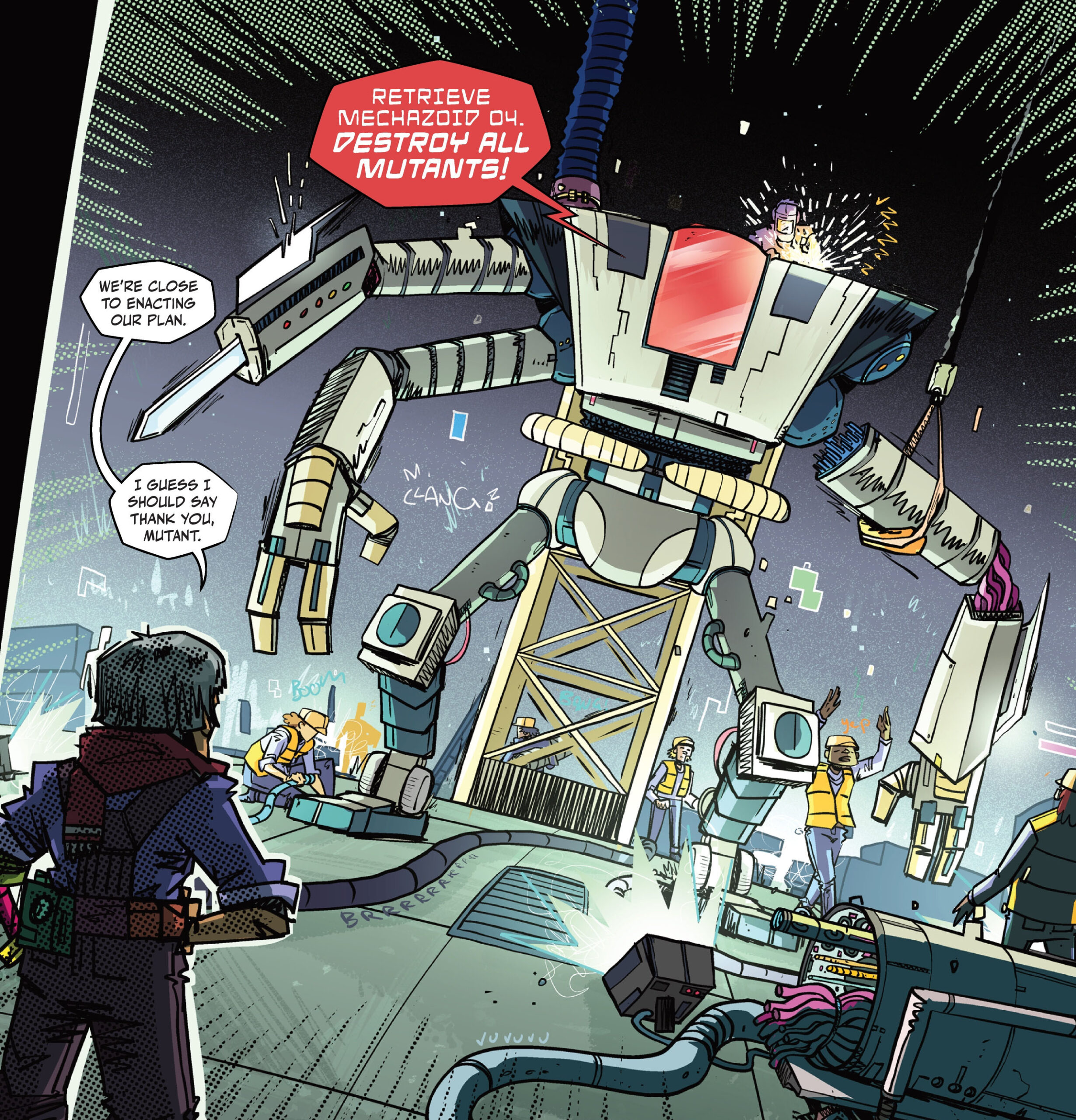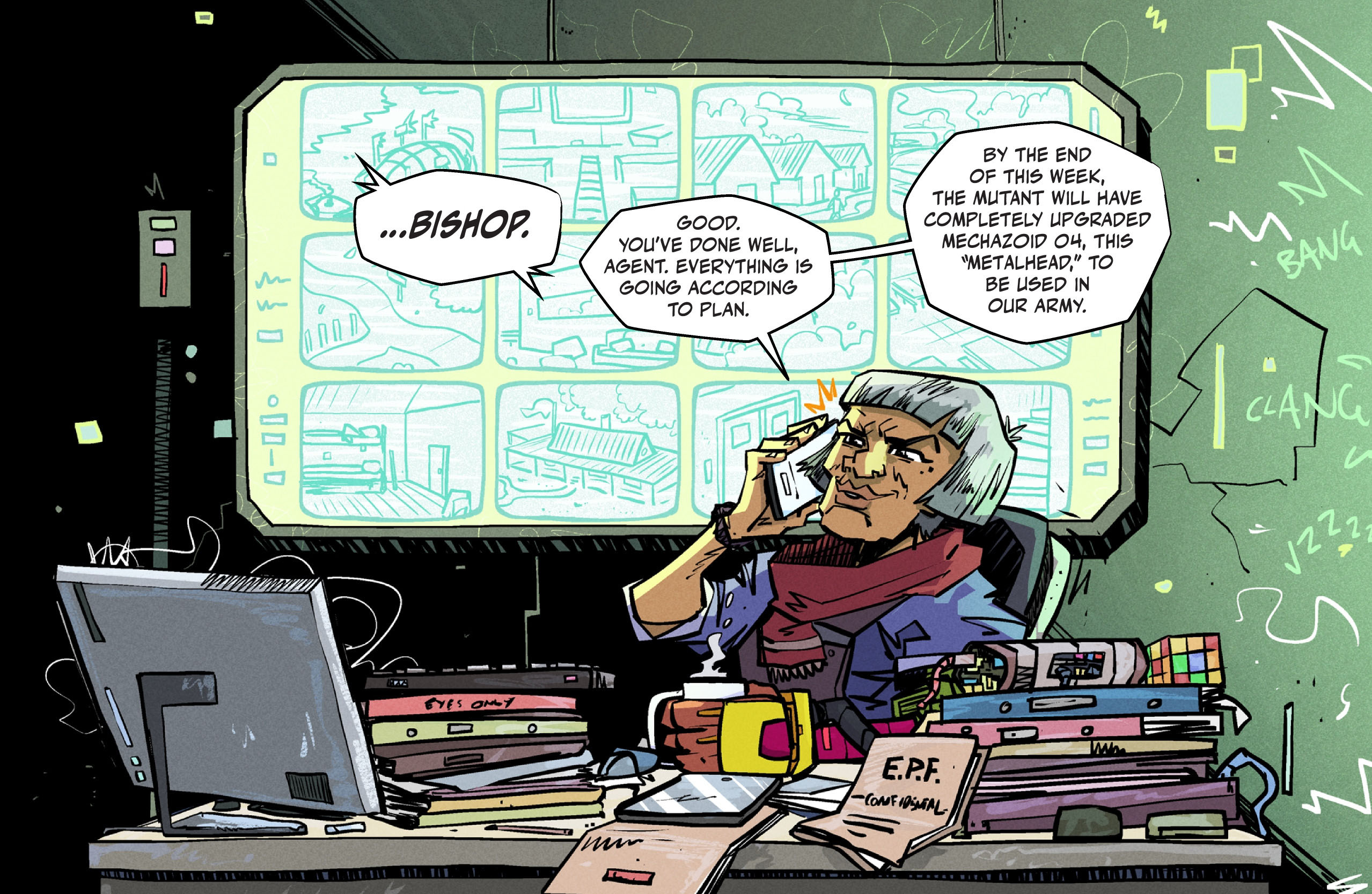 Peu après le combat, le dirigeant du camp recevait un appel. Il s’éloignait des jeunes pour parler tout bas avec son interlocuteur ; Bishop ! La femme était bien décidée à récupérer son Mechazoid 04. Tout se déroulait comme prévu. Donatello et son équipe allaient peaufiner Metalhead tout au long de cette semaine d’affrontements. Son robot lui serait rendu sur un plateau d’argent. Après l’appel, Josefina Bishop se dirigeait vers un groupe d’ouvriers qui travaillaient sur un autre robot, cette fois gigantesque.