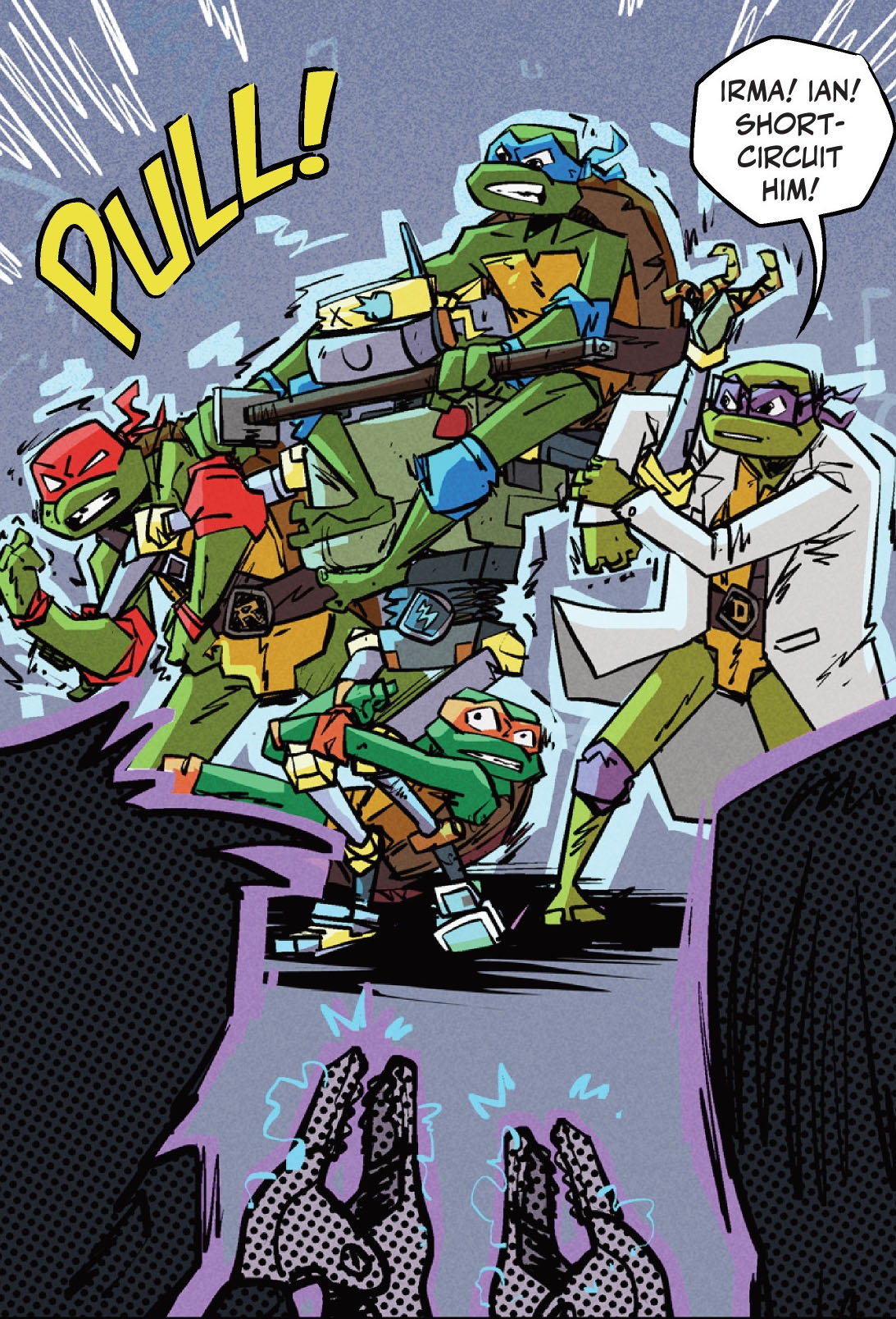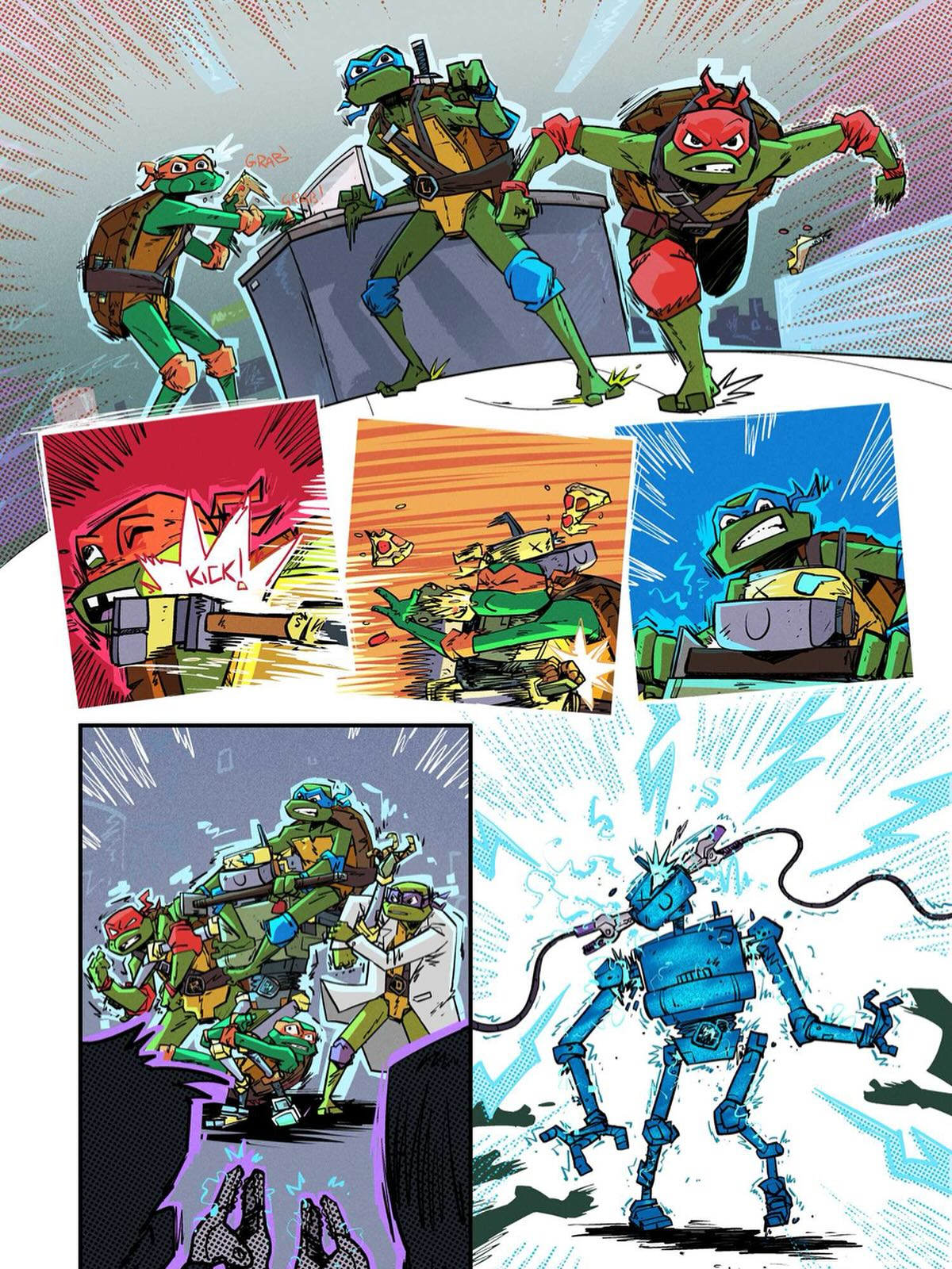 L’expérience était un échec et Donatello se retrouvait de nouveau au point de départ. La tortue commençait à se rendre à l’évidence ; jamais il ne serait en mesure de réparer Metalhead avec aussi peu de moyens. C’est alors que Leonardo arriva avec une excellente nouvelle. On lui avait donné au collège un flyer sur un camp d’été robotique. Exactement ce dont il avait besoin ! Une semaine entière pour travailler sur la machine défectueuse avec du matériel de pointe. Il se mettait déjà au travail. Michelangelo relevait toutefois un détail curieux ; comme cette annonce tombait bien !
