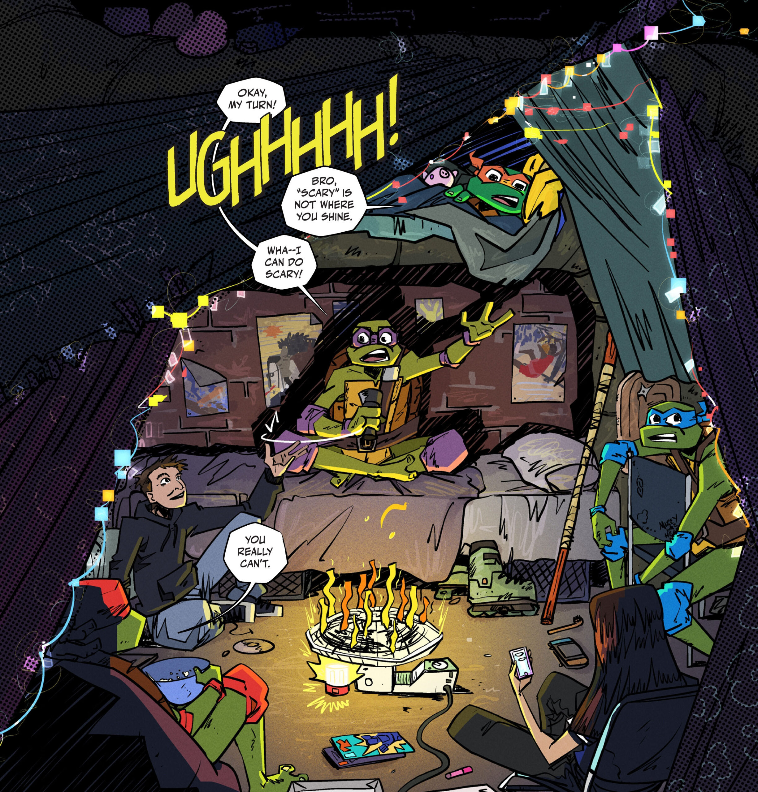 Réunies autour d’un feu de camp de fortune – un ventilateur couché où des lamelles de papier jaunes ont été collées et une lampe de poche en-dessous – les tortues et quelques-uns de leurs amis racontaient des histoires effrayantes. C’était au tour de Donatello de prendre le rôle de narrateur.