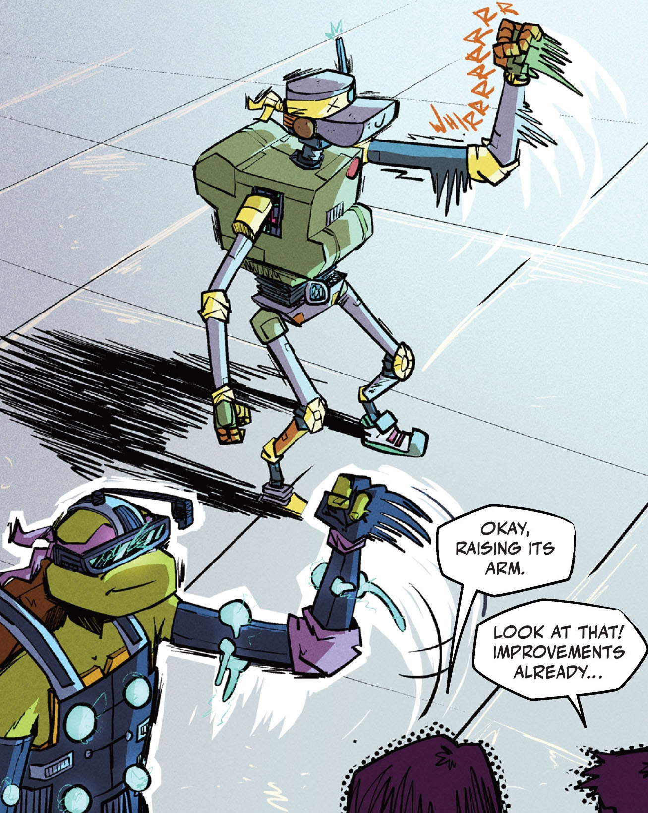 Le reste de la journée, Donatello et ses amis s’affairaient à améliorer Metalhead. La tortue revêtait une combinaison de capteurs afin que la machine reproduise ses mouvements. Tout fonctionnait pour le mieux et le génie voulait pousser les essais plus loin. Ils l’emmenaient vers un parcours d’entraînement pour voir ce dont était capable son invention avec ces capteurs. Là encore, Metalhead brillait par ses capacités et réalisait le parcours plus rapidement que son « maître ».