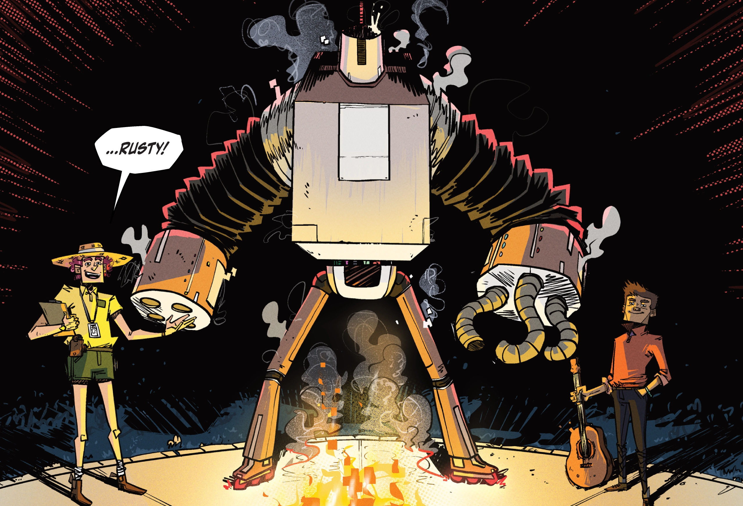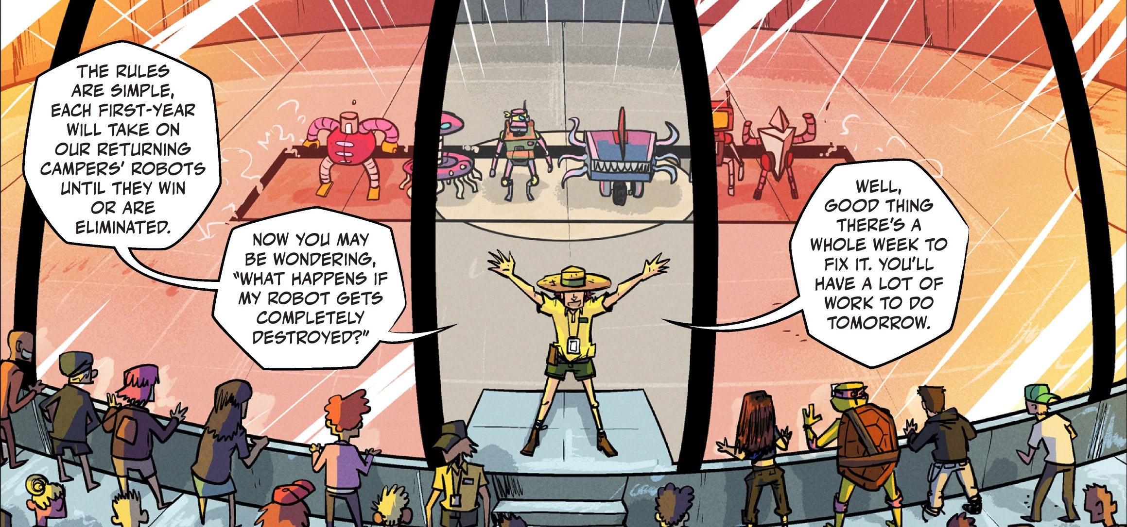 Le soir venu, l’équipe de Metalhead commençait à croire qu’elle avait ses chances de remporter la compétition. Le responsable du camp félicitait les étudiants et annonçait même en observer certains tout particulièrement. Il appelait ensuite Xavier, multi-champion, et son invention, Rusty. Le parc s’éclairait pour laisser apparaître une arène de combat. Tous les robots allaient se battre les uns contre les autres ; Irma savait enfin comment le vainqueur serait sélectionné. Mais dès le premier soir, une équipe allait être sélectionnée pour affronter le champion en titre. En cas de défaite, pas de panique, ils auraient encore toute la semaine pour réparer leur machine.