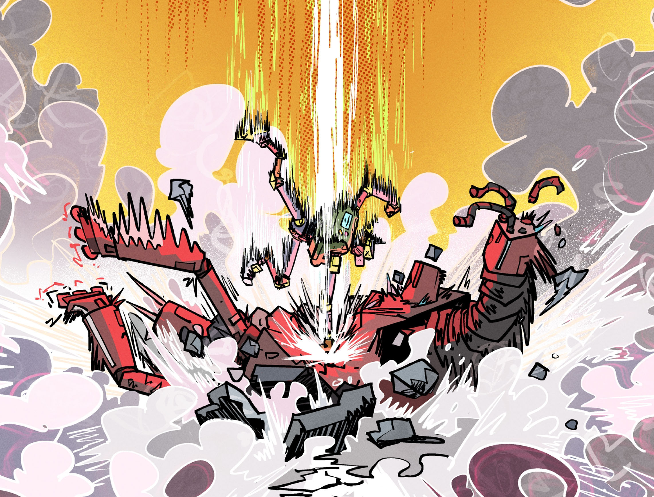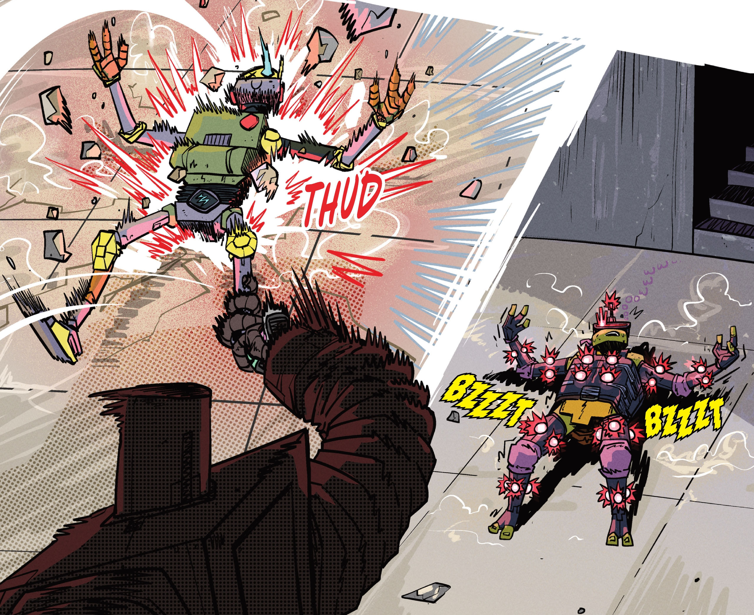 Donatello se retrouvait catapulté dans l’arène avec Metalhead. Face à lui se trouvait l’arrogant Rusty, bien décidé à lui en faire voir de toutes les couleurs. Et dès les premiers coups, le robot géant prenait l’avantage sans aucune difficulté. La pauvre tête d’acier volait à travers l’arène de bout en bout. La tortue pilote, qui revêtait sa combinaison de capteurs, en voyait elle aussi de toutes les couleurs.