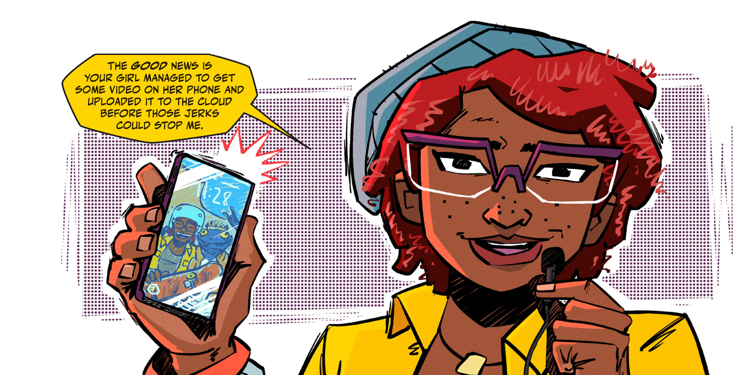 April était sur un coup important ! Elle réalisait un reportage à l’aide de son téléphone sur une mystérieuse explosion dans le bâtiment du T.C.R.I. à Tribeca. Des hommes en noir lui avaient déjà effacé ses prises de vue et sentait que quelque chose d’étrange se produisait. Heureusement pour elle, la journaliste en herbe avait déjà sauvegardé ses vidéos sur son cloud. Il en faudrait plus pour l’arrêter, d’autant que les tortues l’accompagnaient, couvertes d’égratignures. Elles lui racontaient ce qu’il s’était passé.