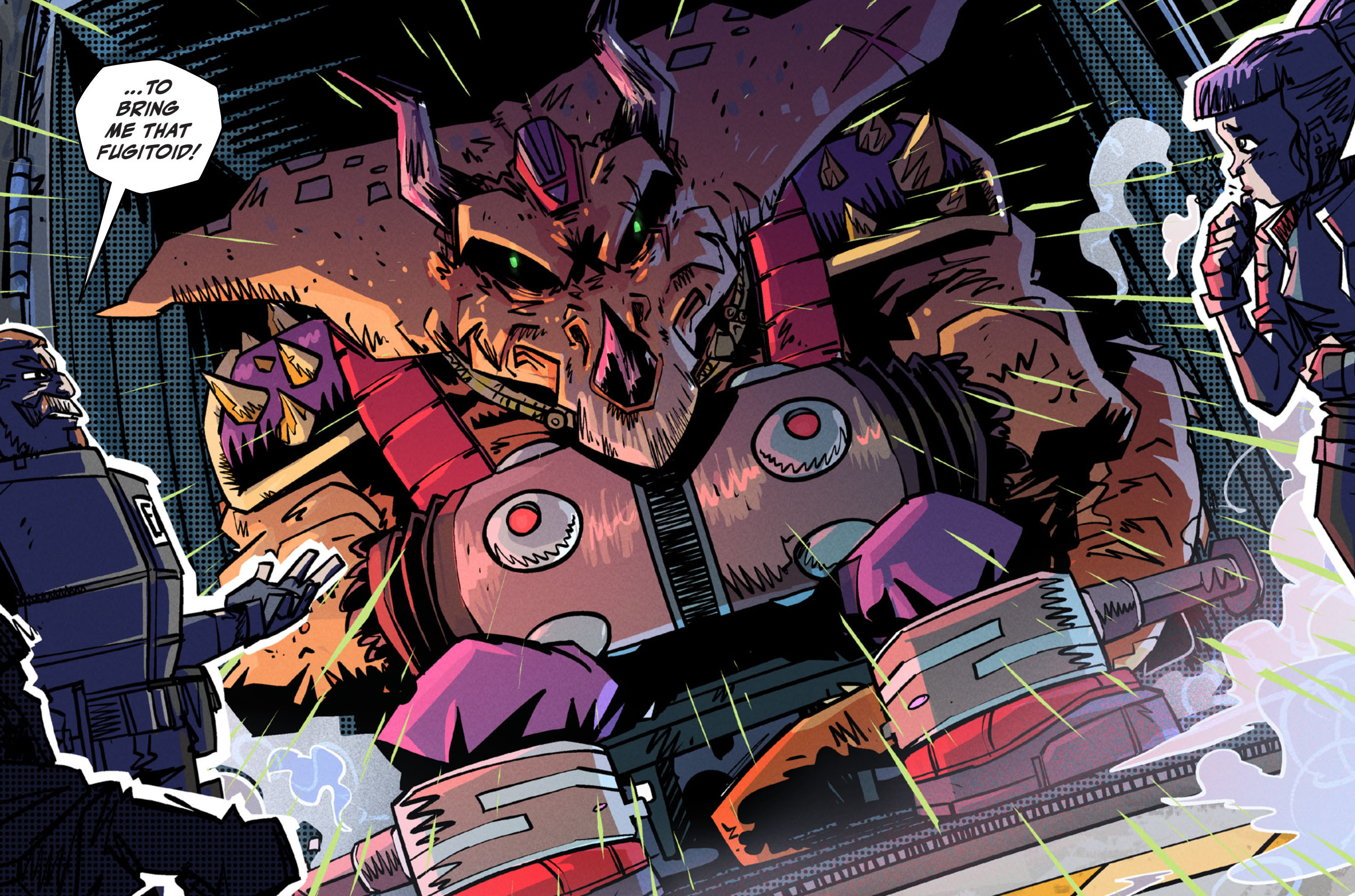 Fugitoid is here: A classic TMNT ally makes his comics debut for this fresh era of turtle power. And he needs help! When the Ninja Turtles run across Fugitoid in the midst of an E.P.F. attack, they aren’t sure they can trust this strange, hyper intelligent robot. But they’ll soon learn that the runaway is more than meets the eye.