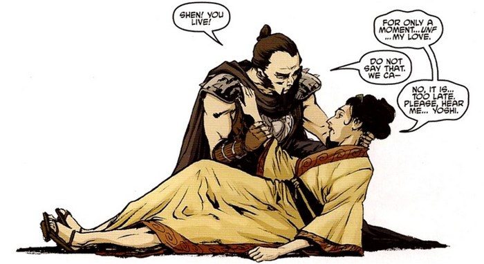 Tang Shen fut la première à connaître la mort. Elle tomba sous le sabre de deux ninjas qui avaient pénétrés dans son domicile. Alors que ces derniers allaient tuer leurs enfants, dans la pièce à côté, Hamato Yoshi survint et tua les intrus. Dans un dernier souffle, Shen fit promettre à Yoshi qu’il ne tenterait pas de la venger. Il fallait qu’il mette à l’abri leurs enfants avant tout. Yoshi promit et partit avec leurs quatre enfants. Ils vécurent cachés durant onze ans, jusqu’à ce que Saki les retrouve et les exécute (TMNT #5).