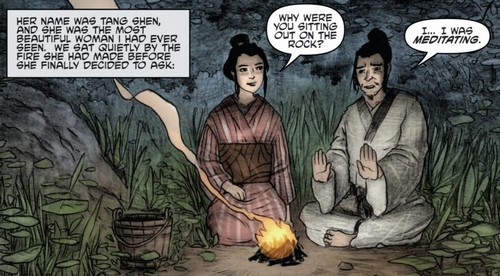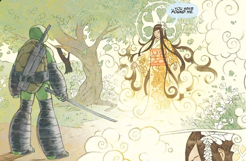 Après que Donatello ait été grièvement blessé par Rocksteady (TMNT #44), Tang Shen lui apparut et lui parla calmement. Elle lui proposait deux alternatives. Soit le chemin vers la lumière vive, chaleureuse et rassurante, soit vers un chemin sombre, incertain et pourtant peut-être pas aussi négatif qu’il en avait l’air. Il devait faire son choix, mais jamais il ne serait seul, quel que soit son choix. Splinter en pleine méditation vint guider l’esprit de son fils à travers ce jardin cerclé par un labyrinthe de buissons. Il devait agir vite avant que son fils ne fasse un choix définitif. Il pouvait encore le sortir de là.
