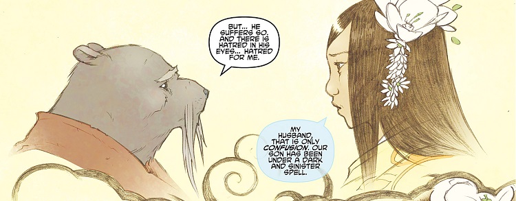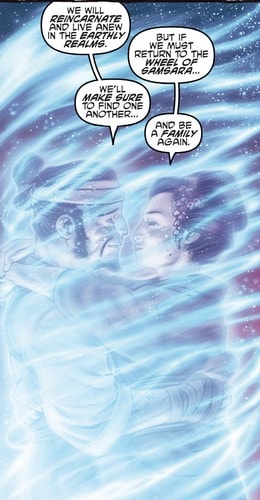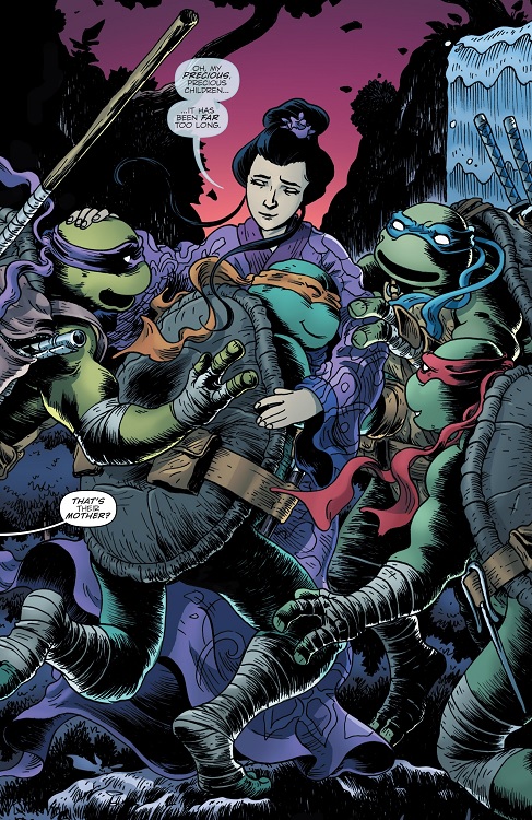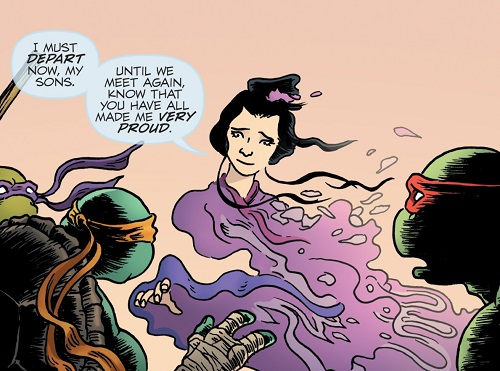 L’esprit encore torturé, il préférait rester à l’écart et écouter les conseils avisés de l’esprit de sa mère. Elle apparut également aux yeux de Splinter, blessé, qui avait honte de la manière dont les choses avaient tournées, toujours pour le réconforter (TMNT #30).