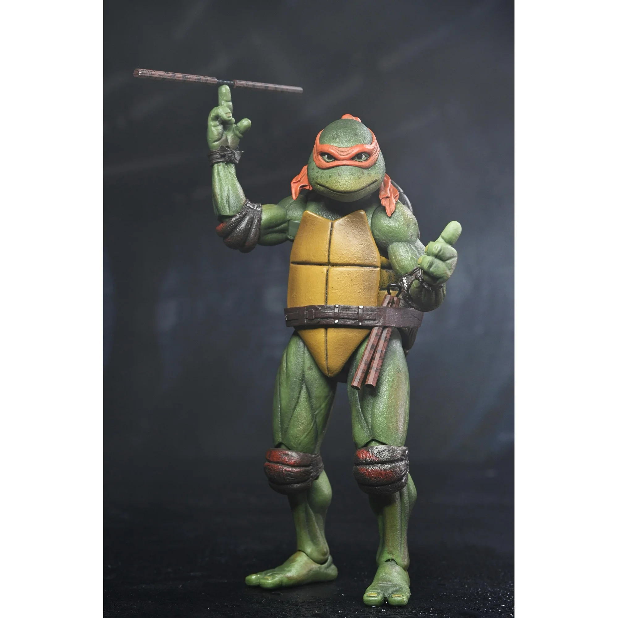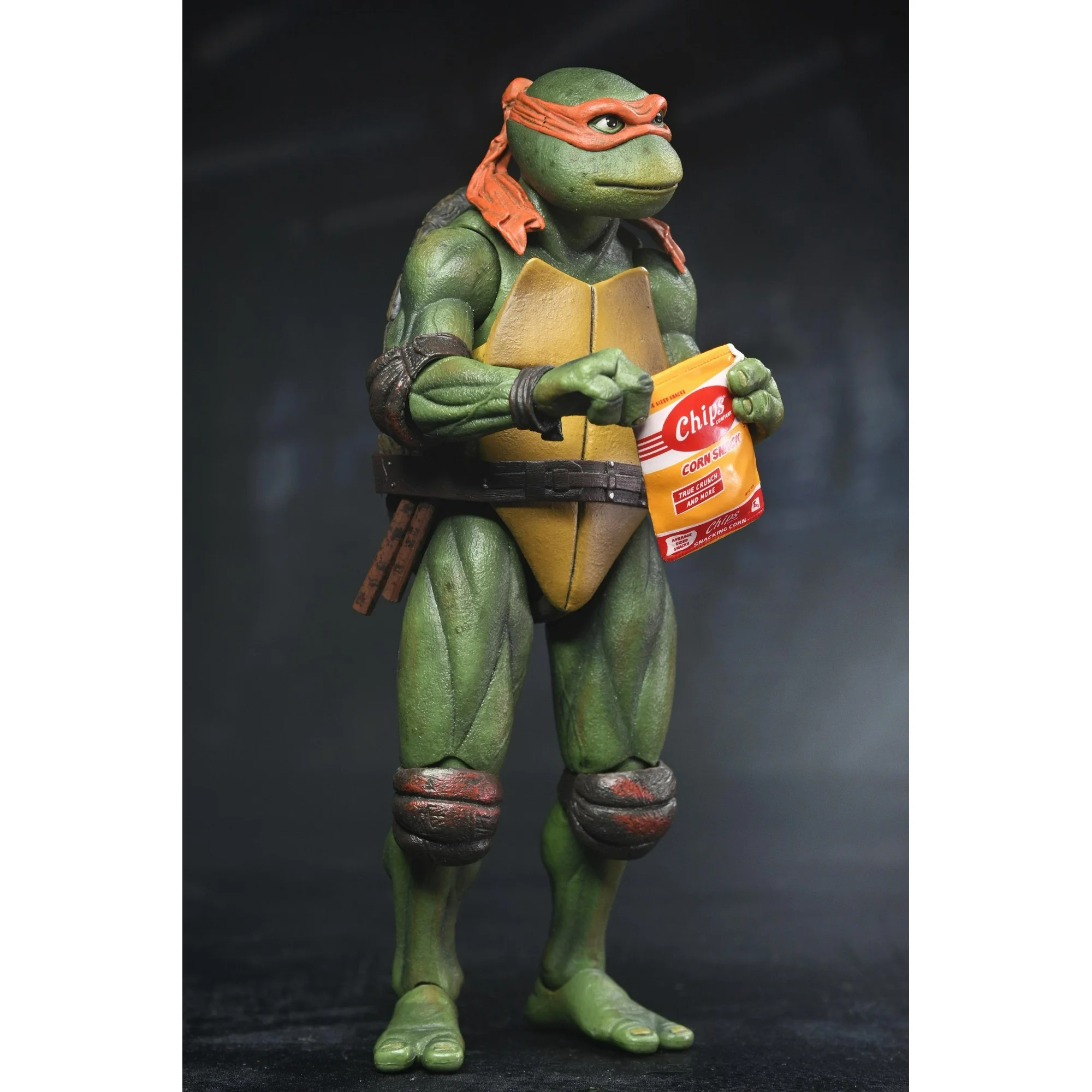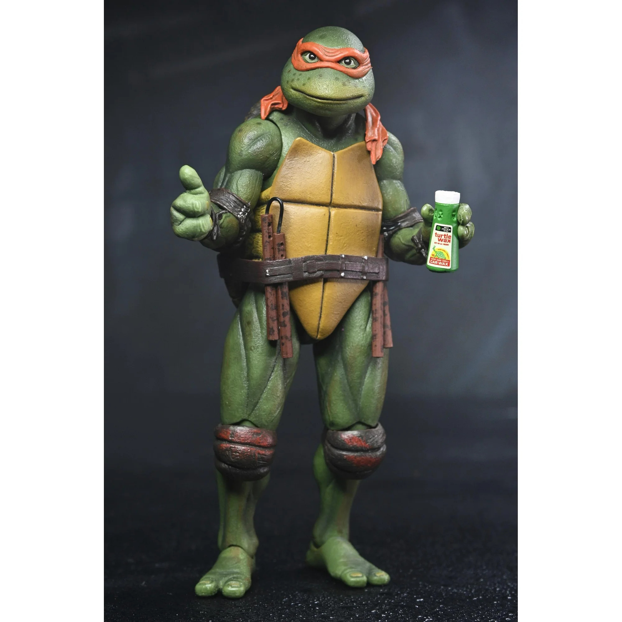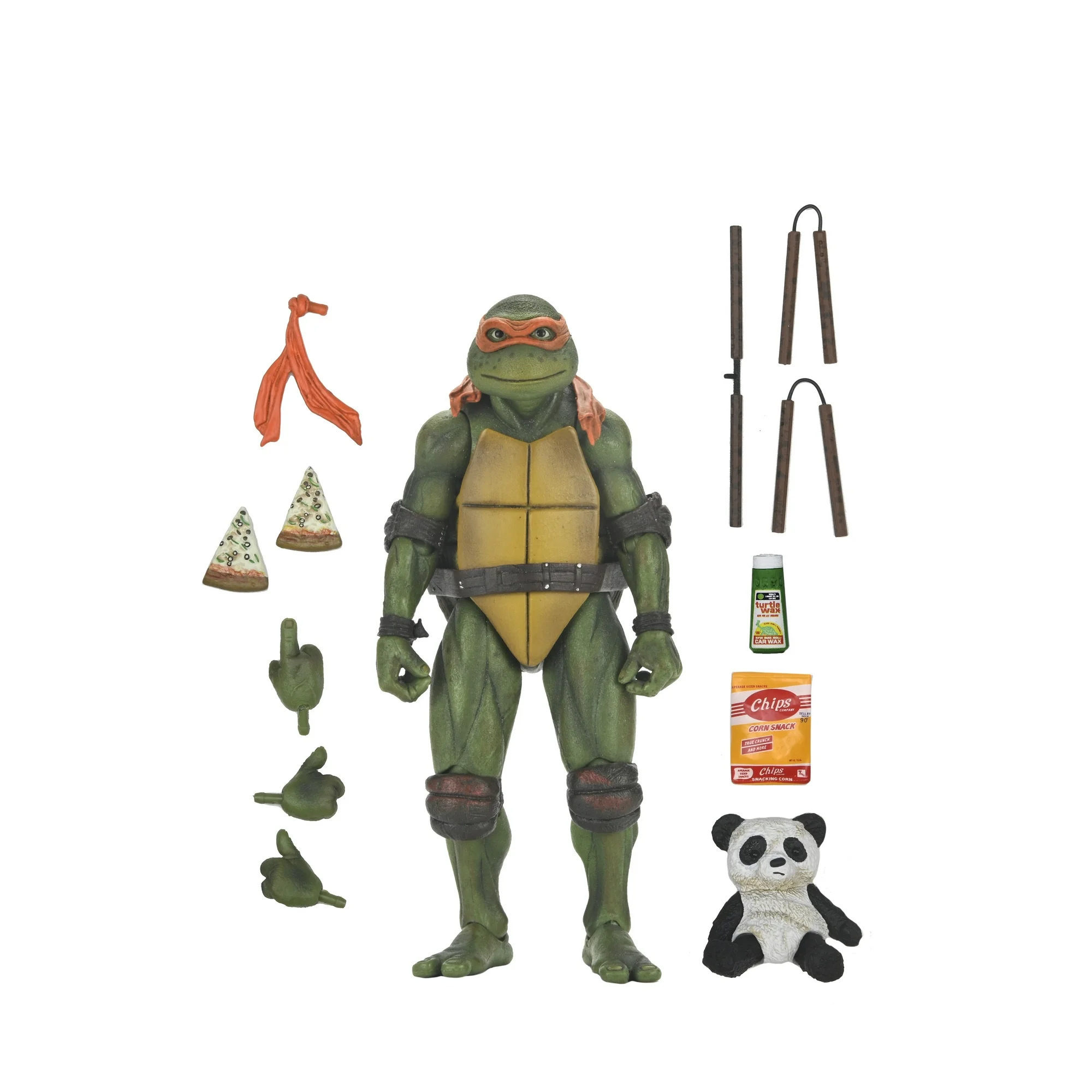 Michelangelo est accompagné de deux parts de pizza, de la peluche du panda et d’un flacon de cire, initialement proposées dans le pack d’accessoires. Le reste de la sculpture et des accessoires sont identiques au Michelangelo de 2018.