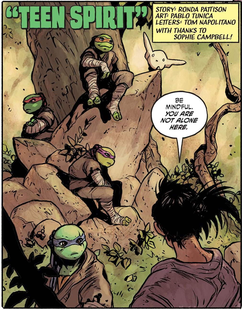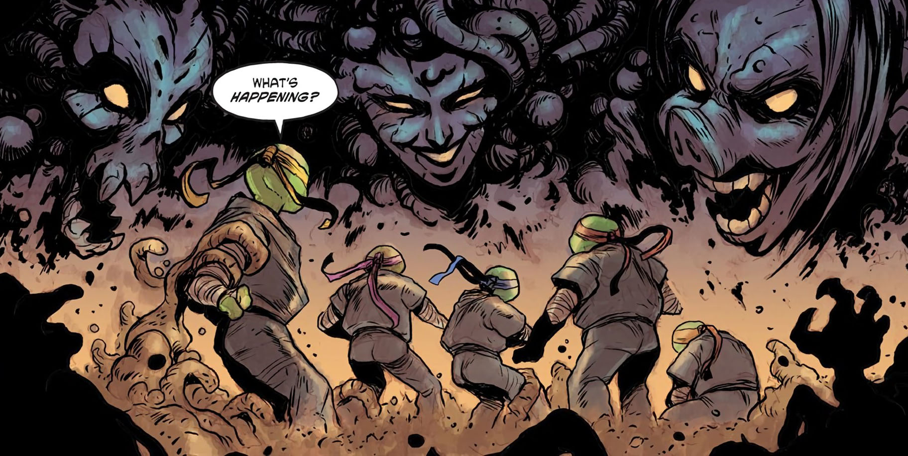 Les tortues reprenaient leurs esprits après tout ce désordre. Mais elles n’étaient pas au bout de leurs surprises. Un nuage gris prenait la forme d’un loup. La terre se levait et formait des lianes qui étreignaient Jennika. La forme se transformait en Shredder. La jeune femme ne pouvait pas bouger. D’autres visages effrayants se matérialisaient, comme celui de Sheena. Des mains sortaient du sol. Les tortues étaient encerclées. Puis c’étaient des yeux qui se matérialisaient entre les troncs des arbres. Leonardo comprenait ce qu’il se passait. En faisant n’importe quoi, ils provoquaient le courroux des esprits du lieu. Il cherchait à s’expliquer pour qu’ils les épargnent. La tortue demandait à ses frères de ne plus utiliser la moindre magie. C’était ce qui les avait énervés. Michelangelo proposait plutôt qu’ils révoquent ce qu’ils avaient créés. Les tortues se tenaient droites et se concentraient. Elles parvenaient à annuler le désordre provoqué.
