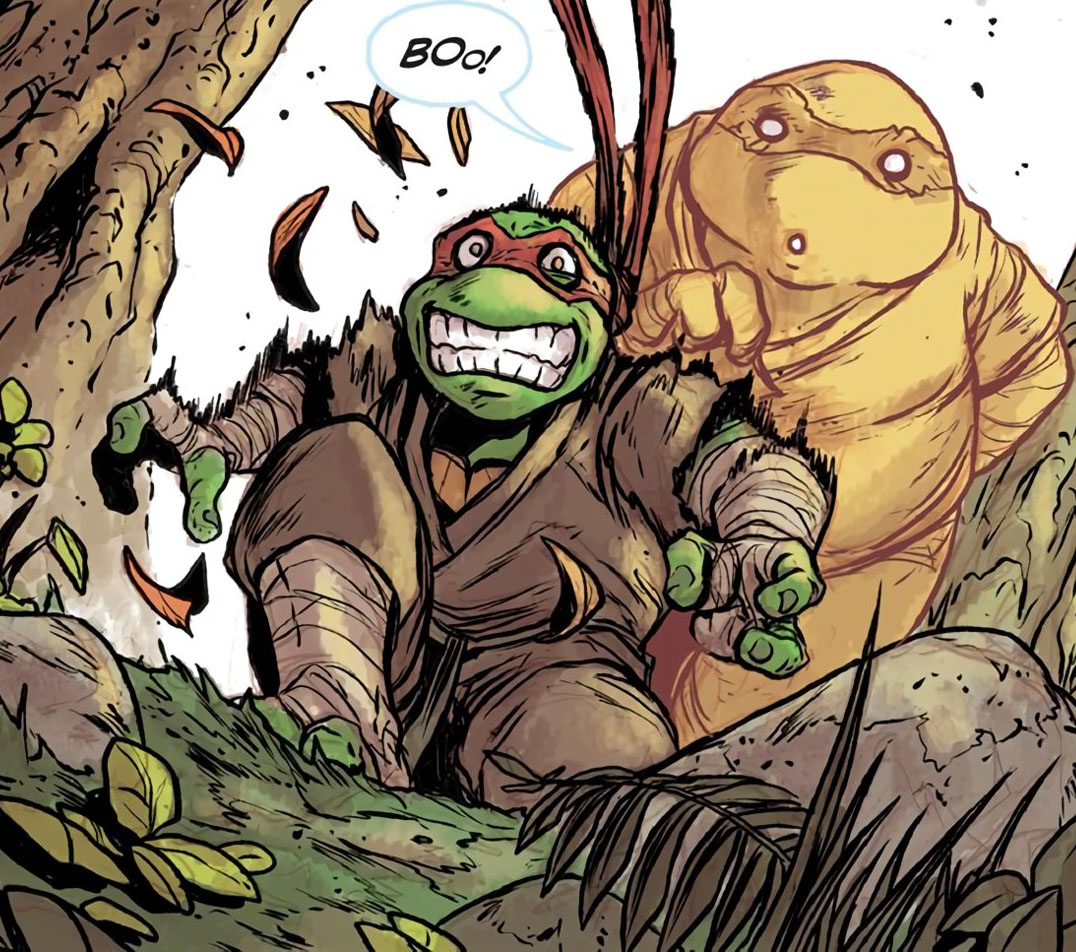 Alors qu’il cherchait à les retirer au plus vite, Donatello détachait son esprit de son corps, ce qui surprenait Raphael. La tortue n’était pas au bout de ses surprises, une créature prenait forme dans son dos pour le faire sursauter. L’œuvre de Jennika qui ne pouvait s’empêcher de le taquiner.