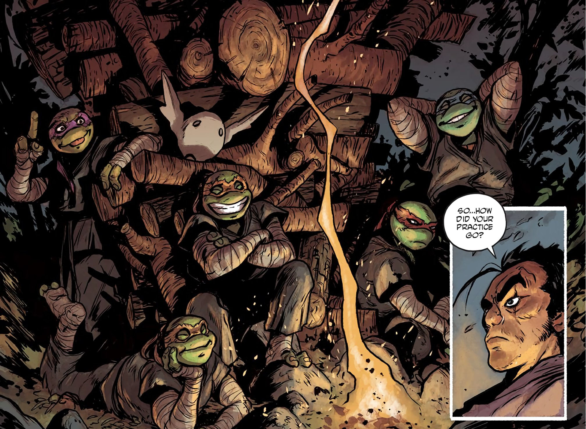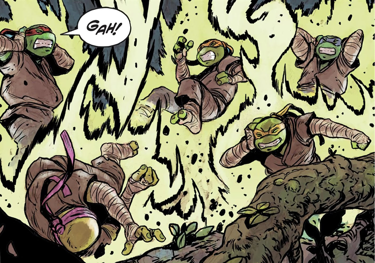 Sans perdre de temps, Michelangelo faisait un bond et explosait d’un geste une branche au-dessus de Raphael, qui s’écrasait à ses pieds. Face au courroux de son frère, Michelangelo essayait d’apaiser la situation. Donatello voulait les arrêter, mais produisait un son trop puissant depuis sa bouche. L’emploi de leurs nouveaux pouvoirs était un véritable désastre. Très vite, Saki entendait le remue-ménage dans les bois et apercevait bientôt des éclairs sortir des arbres. Il revenait au plus vite sur ses pas.