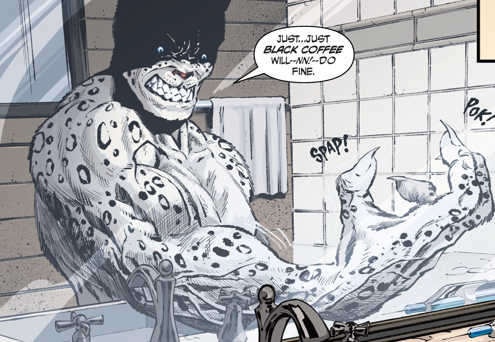 De retour vers le manoir, Marlin donnait au félin sa montre à gousset en signe de reconnaissance. Le léopard des neiges avait apporté ces deux mutants et fait du très bon travail. Mais entre ses mains, le petit objet se brisait. Il avait beaucoup de mal à contrôler sa force. Seul le Nostrum pouvait l’aider à améliorer sa situation. L’homme qui veillait sur lui tendait une seringue avec ce qu’il restait de ce mystérieux sérum. Ils attendaient une nouvelle cargaison. Cette dernière seringue devait pouvoir le faire patienter un petit peu. Marlin partait manger avec sa famille. Ludovic lui demandait s’il pouvait se joindre à eux, tel un vrai humain. L’homme préférait remettre ce grand repas à une autre fois…