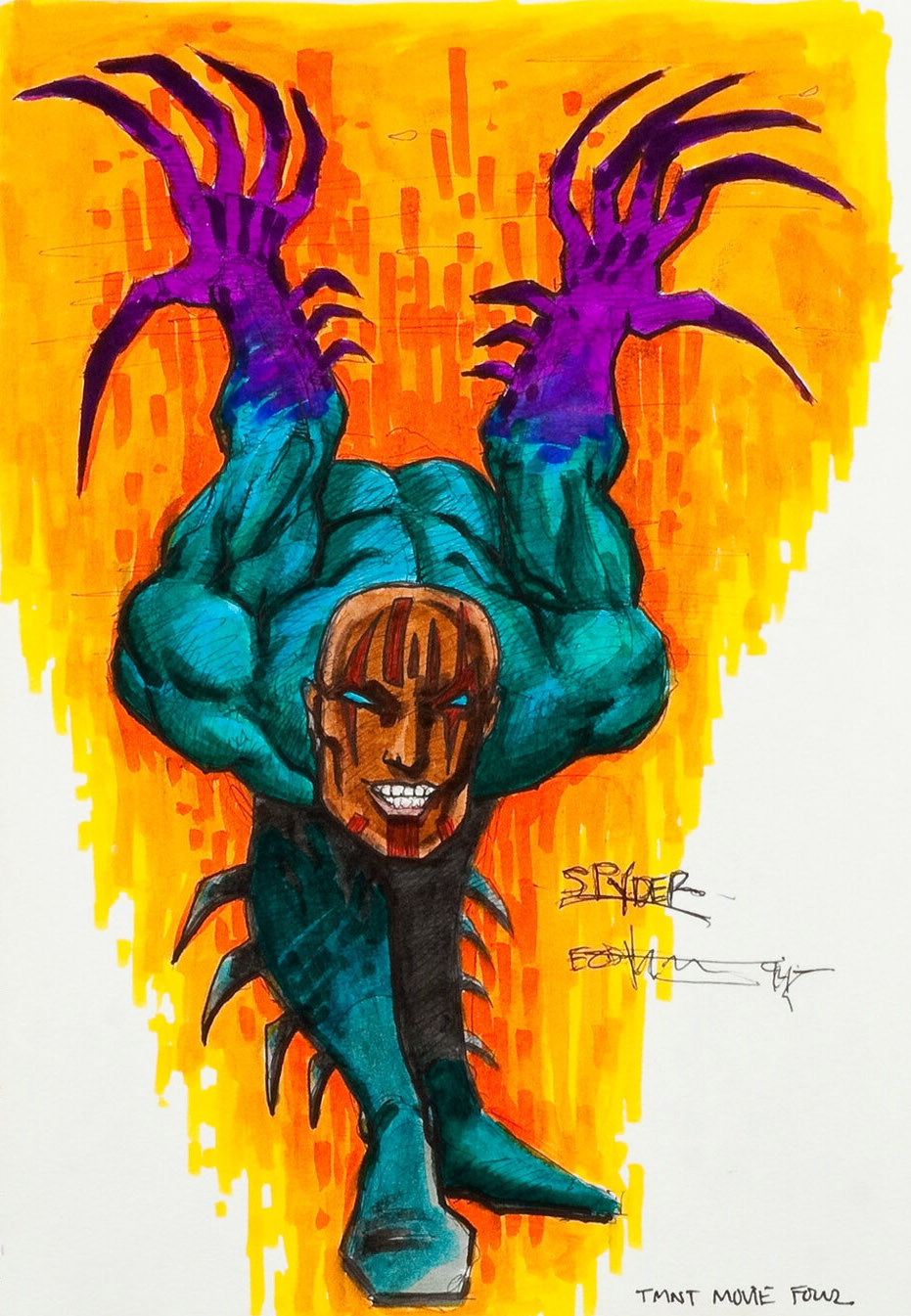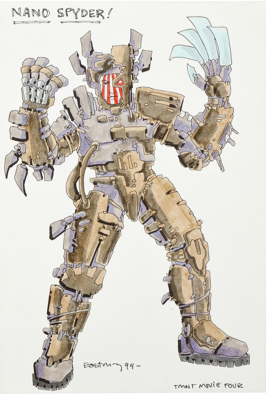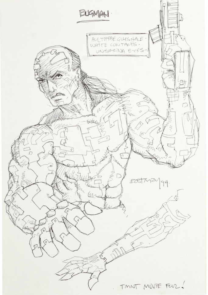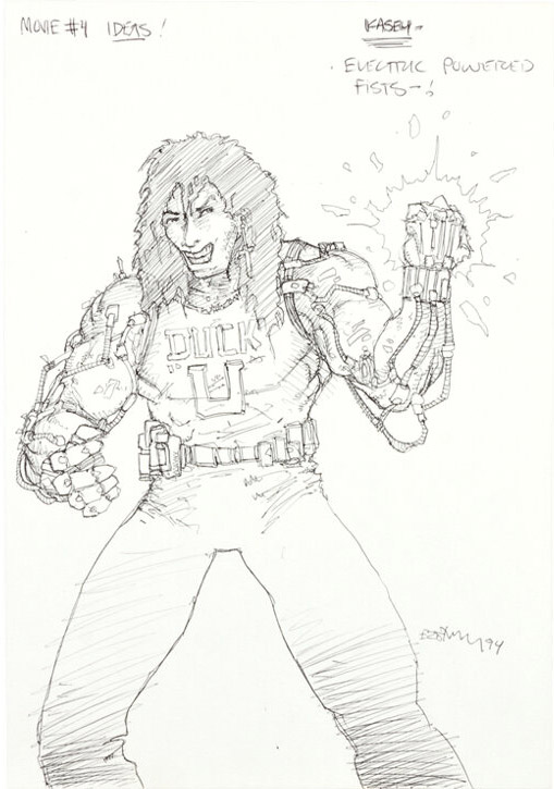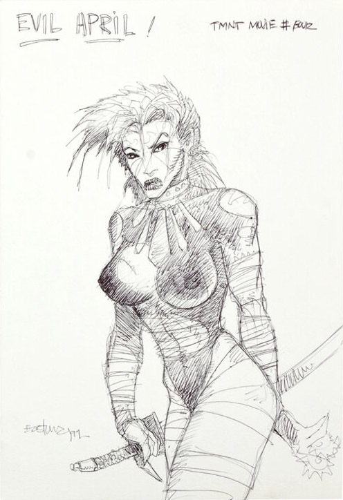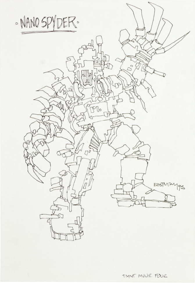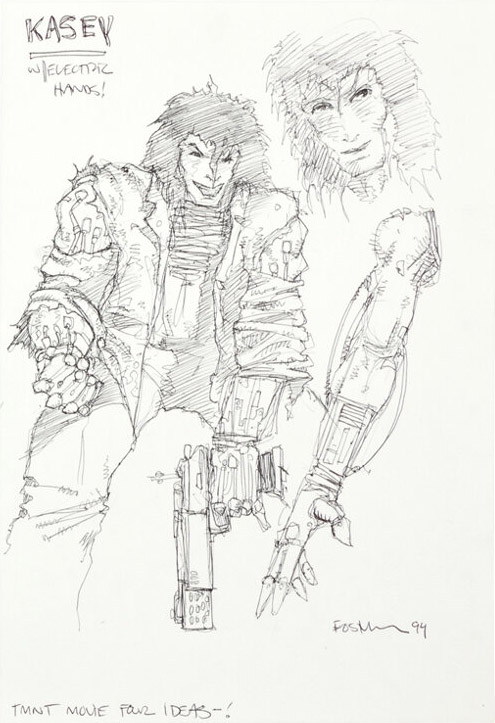 Et c’est vers Spyder que notre attention se porte, puisque deux personnages bien familiers se retrouvent modifiés dans ce film : April, dont un concept art la caractérise comme Evil April et Casey Jones, dont le personnage est orthographié (volontairement) Kasey. Ce dernier aurait possédé une technologie en lien avec l’électricité. Se pourrait-il que les amis des tortues soient devenus des ennemis ou auraient été copiés par une technologie de nanorobotique ? Le dessin ci-contre d’Eastman montre les tortues en train de se battre contre une femme et une créature électrifiante, probablement April et Kasey.
