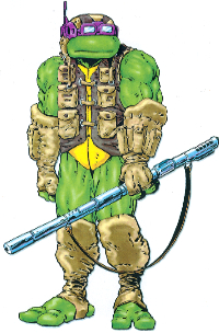 La transformation de Donatello était plus subtile. Si d’apparence rien ne changeait réellement, la tortue aurait gagné des pouvoirs télékinétiques et de télépathie. Hélas pour lui, en contrepartie, sa vue aurait grandement diminuée, le contraignant à porter des lunettes. Eastman et Laird avaient également imaginés un bâton amélioré et en métal7.