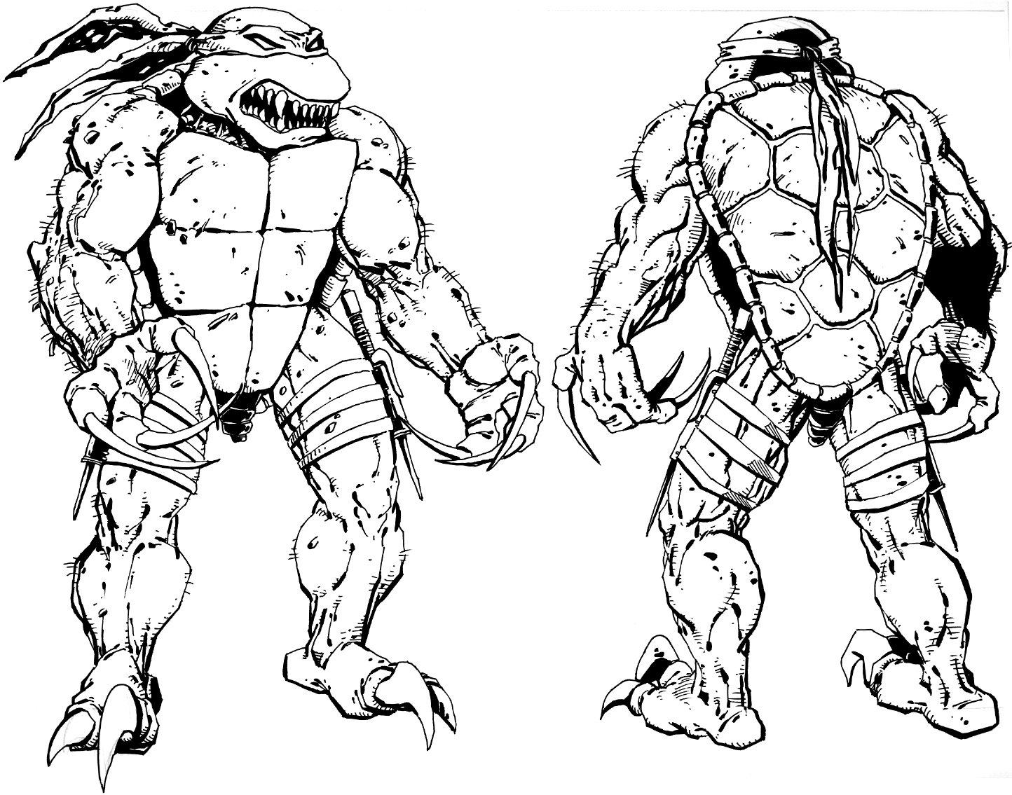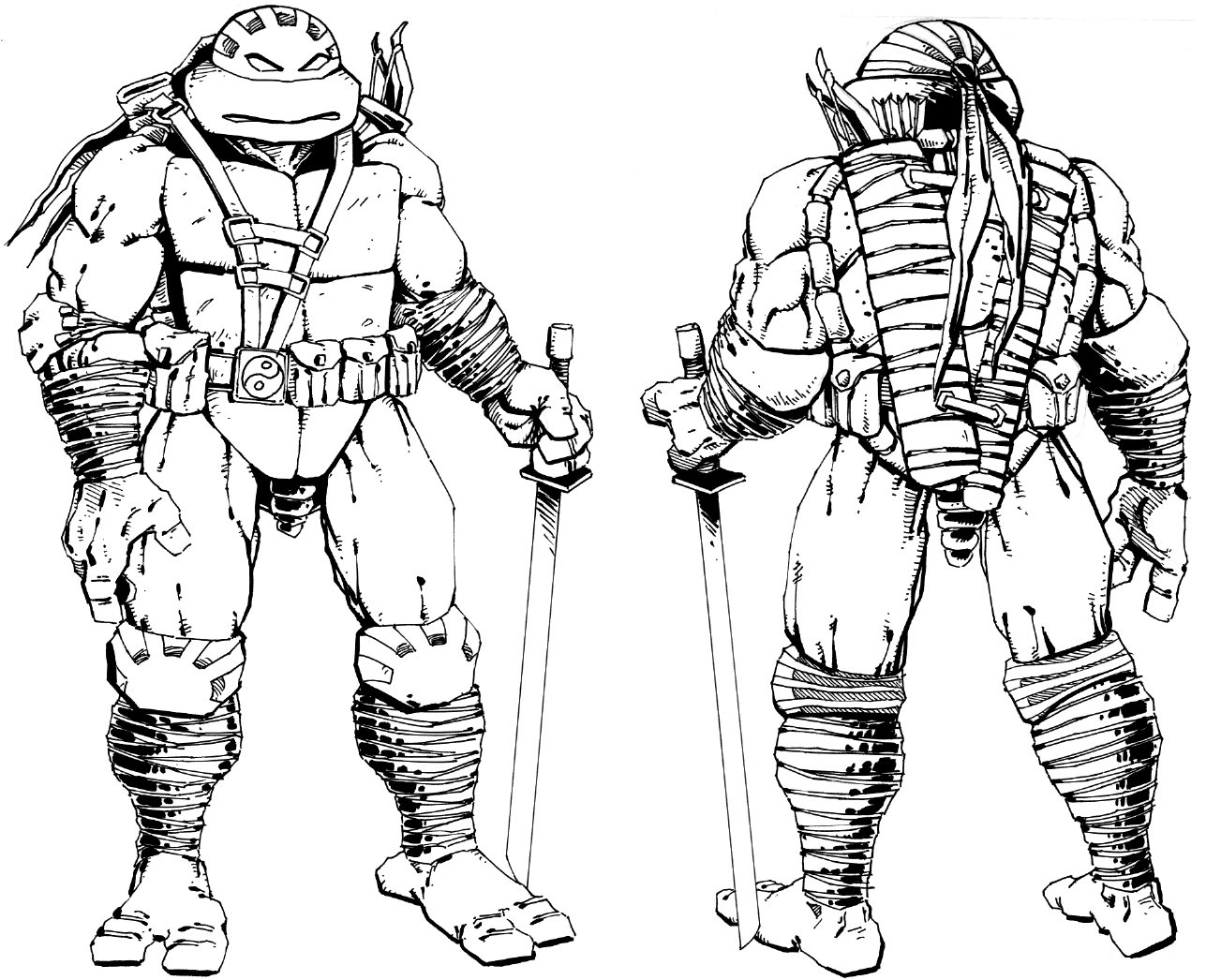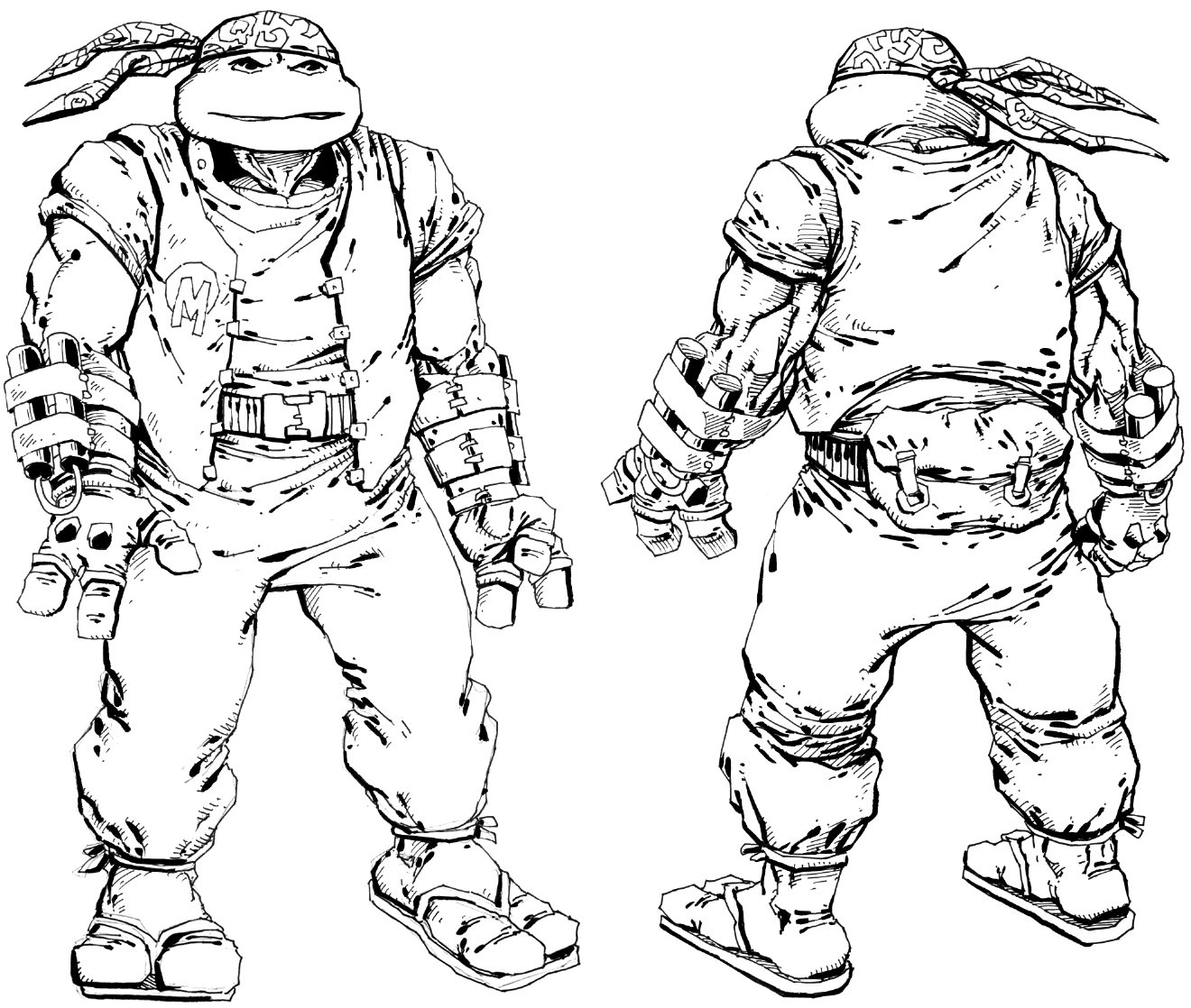 À ce jour, nous ne possédons que quelques croquis de cette tortue, presque tous signés de Kevin Eastman. Une ébauche plus récente (Fig. 4) nous montre une tortue très ordinaire. Son côté solitaire était renforcé par ce manteau à capuche. Sur les autres dessins, il apparaît que Kirby possédait quatre doigts aux mains et trois aux pieds. De quoi le distinguer des quatre frères ! Enfin, la figure 12 est un dessin de Michael Dooney, probablement pour une figurine de Playmates Toys.