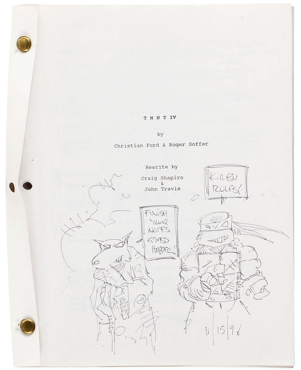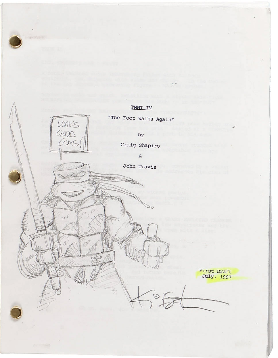 Le jet a été profondément remanié et un nouveau titre était octroyé au film, jusqu’alors sobrement intitulé « TMNT IV ». Le titre précédent ne pouvait être conservé, la série Ninja Turtles : The next mutation étant déjà en développement en mars 1997 (en savoir plus).  Il s’agissait de  « The  Foot walks again ». Le premier jet de ce nouveau projet était daté de juillet 1997.