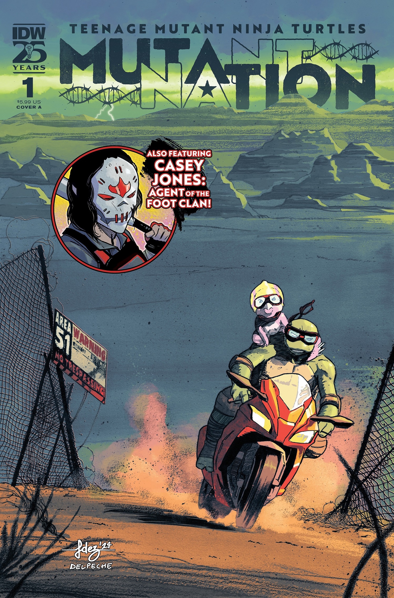New ongoing series! Part 1 of the Raphael flashback adventure arc « Attack on Area 51 »! Expect old favorites and new surprises in this new ongoing series! Between the events of TMNT #150 and the new TMNT #1, the Teenage Mutant Ninja Turtles found themselves at a crossroads, attempting to keep their family united while individually feeling the need to break away and explore life in a world that knows about mutants. To clear his head, Raphael is heading west when a dormant enemy out for revenge on the Turtles engineers a dangerous detour to Area 51. When Raphael is held hostage with some unexpected old friends, his soul-searching quest mutates into a crisis as he brawls in the desert to keep the Earth Protection Force cache of coveted technology out of the wrong hands. Will Raphael find his new purpose away from his brothers…or just more trouble than he can handle alone? Tom Waltz, the TMNT mastermind and co-writer of TMNT: The Last Ronin, returns to tell brand-new stories about everyone’s favorite anthropomorphic misfits with artist Vincenzo Federici. Plus, writer Erik Burnham and fan-favorite TMNT artist Mateus Santolouco present a four-issue bonus backup: after the events of The Untold Destiny of the Foot Clan, can Casey Jones tolerate Karai’s descent into ruthlessness, or will he turn his back on the Foot? The answer ripples into the upcoming action in Jason Aaron’s TMNT! Each arc of Mutant Nation will feature two stories exploring different corners of the TMNT universe, easily accessible to casual fans but with ties connecting the ongoing series and Nightwatcher.