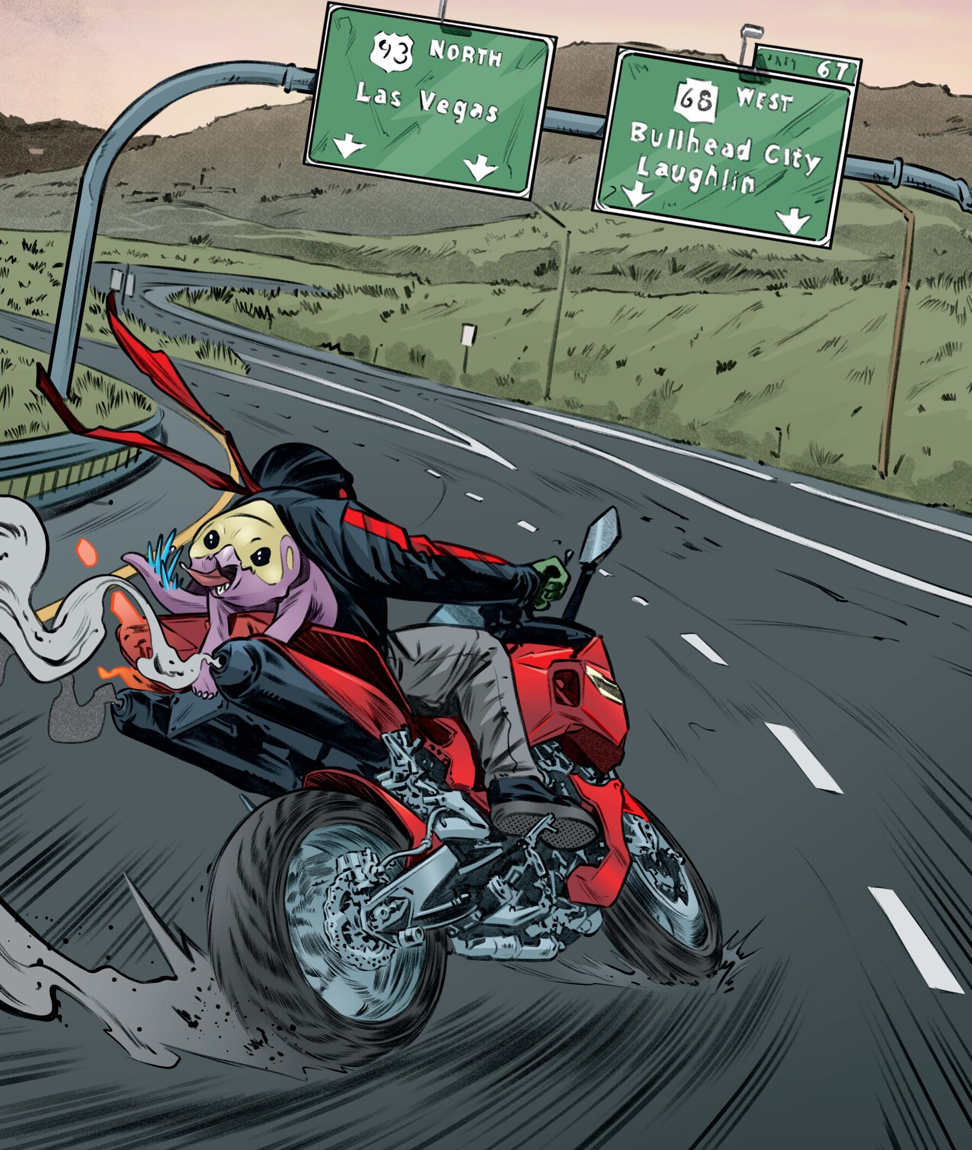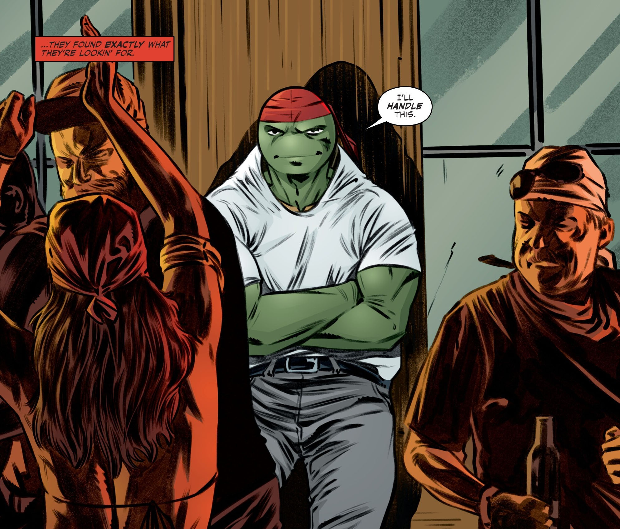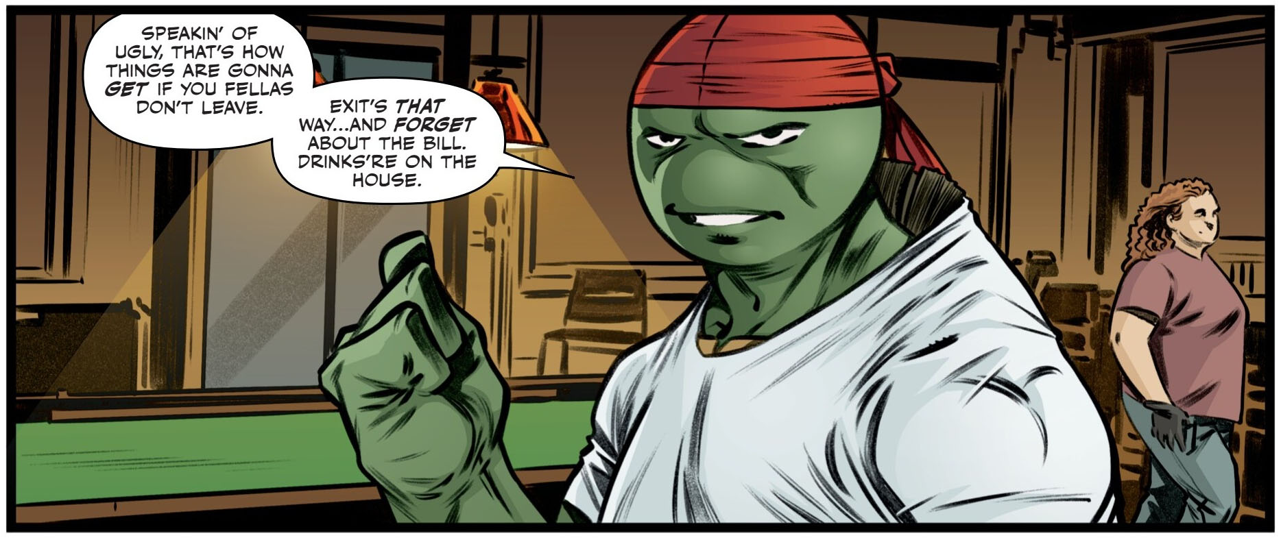 Voilà quasiment une année que Raphael et Pepperoni avaient pris la route (TMNT #144). Et remonter sur sa moto lui avait manqué, il était ravi de pouvoir traverser le désert à toute vitesse. Il était revenu pour les fêtes de Noël à Northampton. April avait demandé à Harold Lillja de le téléporter pour aller plus vite. C’était bon de retrouver sa famille à la campagne. Tout se déroulait pour le mieux, jusqu’à ce que Donatello revienne contre toute attente (TMNT #150). De le voir aussi fébrile, abattu par tout ce qu’il avait traversé au cours de son voyage spatio-temporel (First, last, always) insupportait Raphael au plus haut point. Il ne pouvait rester plus longtemps et avait repris la route. Peu après cette fuite en avant, la tortue avait trouvé ce travail dans le restau-route de Janice. Une manière de gagner de l’argent pour poursuivre. Mais aussi une manière détournée de se défouler de toute cette colère et de cette frustration. Tout ce que la tortue désirait dorénavant, c’était s’amuser un petit peu à Las Vegas.