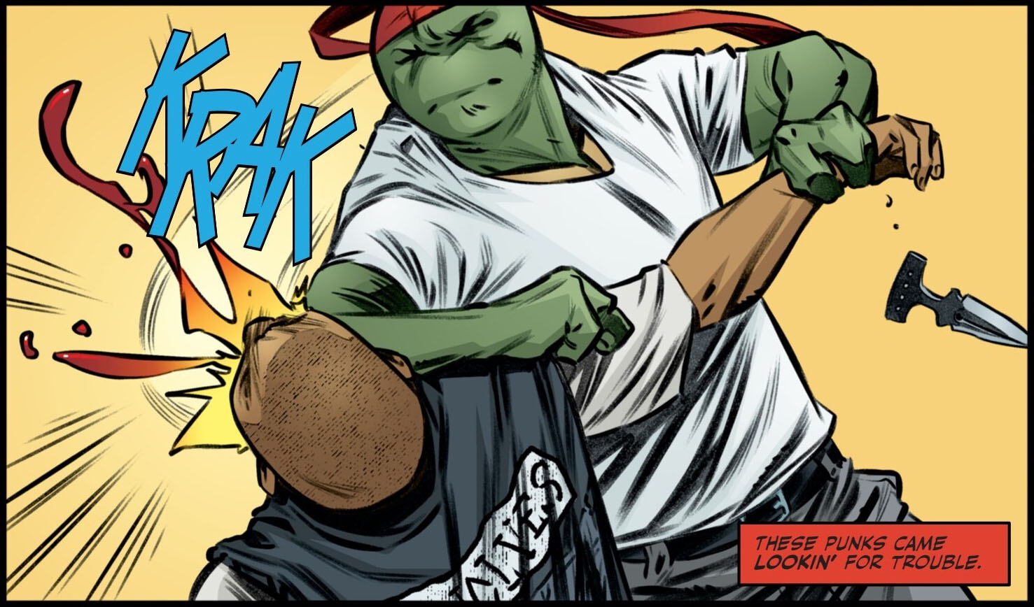 Et ce n’était pas pour déplaire à la tortue qui se faisait provoquer. Un premier coup de poing fusait, que Raphael évitait tout en rendant le coup, qui trouvait sa cible. Immédiatement après, il esquivait une autre attaque, cette fois avec une lame. Là encore, l’individu terminait au sol.