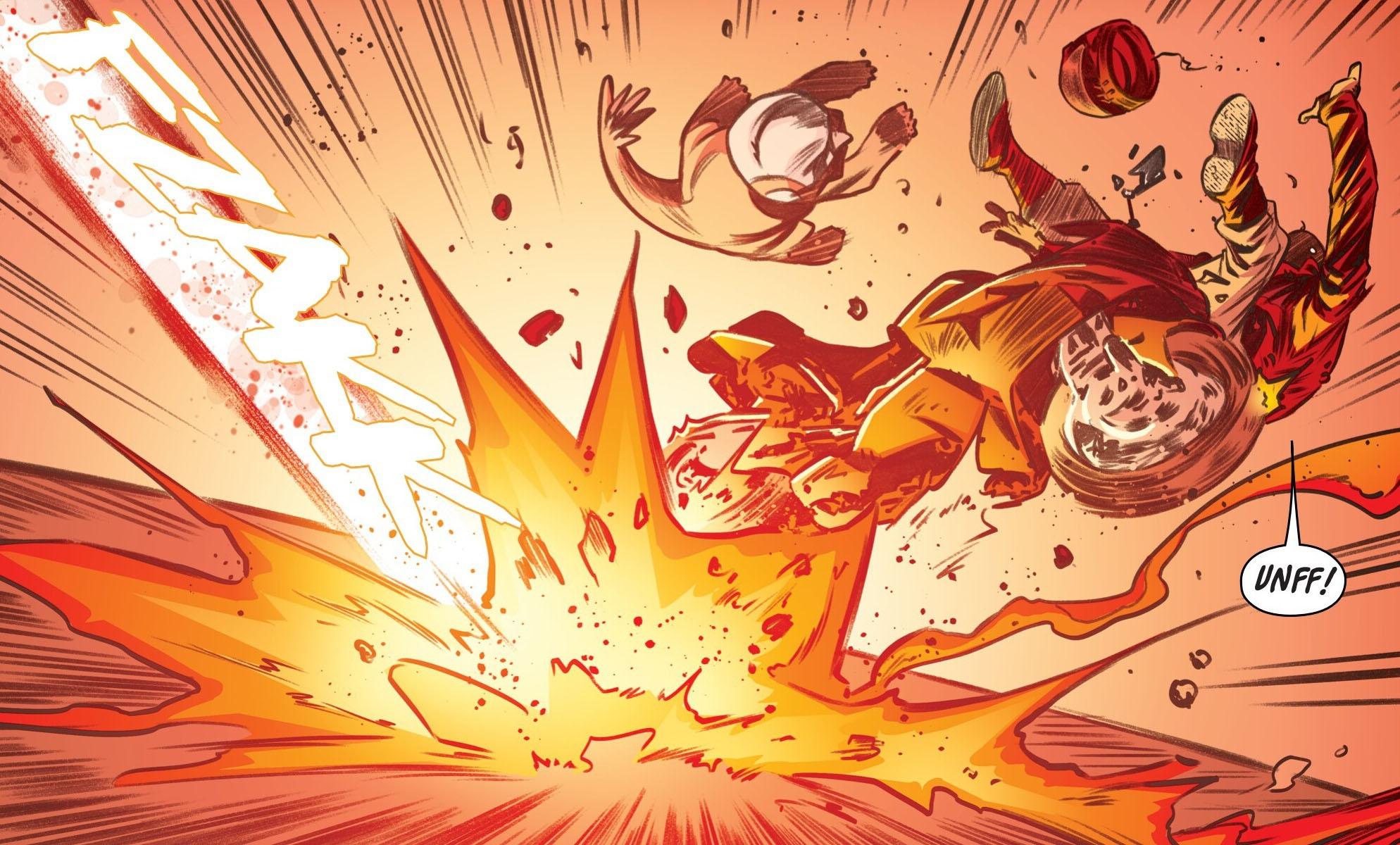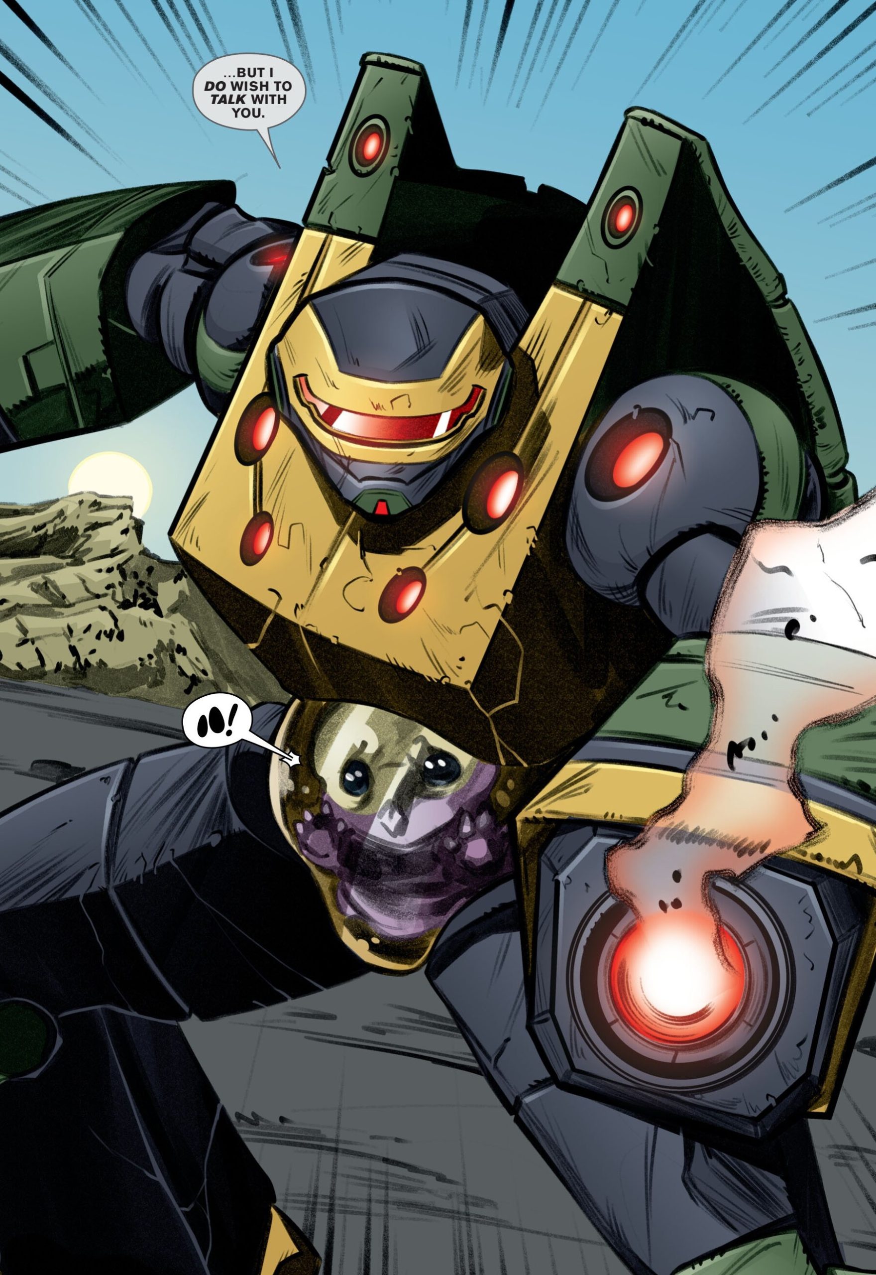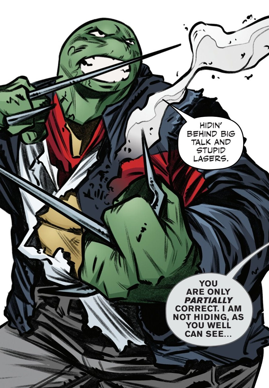 Soudain, Raphael entendit une voix robotique lui parler et s’adresser à lui par son prénom. À peine la tortue avait-elle le temps de se retourner qu’elle essuyait une nouvelle explosion. Ou plutôt un tir, réglé seulement à 25% de sa capacité réelle. De quoi ne pas lui faire (trop) de mal. Il s’agissait de Metalhead. Le robot avait quelque chose à lui demander.