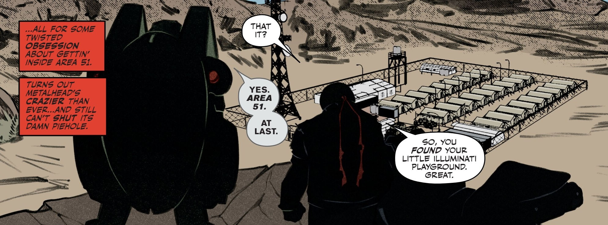 Bien décidé à prendre sa revanche sur Donatello, il partit pour Mutant Town et retrouva le dojo des tortues totalement détruit (TMNT #125). La machine passa les mois suivants à trouver des informations sur la localisation des tortues jusqu’à retrouver la trace de Jennika, qui passait du bon temps avec Sheena avant d’assister à un concert. Au détour d’une discussion avec sa compagne, elle lui confiait que Raphael se trouvait dans le Nevada (Mutant Nation #1). À ces mots, Metalhead oubliait totalement sa cible principale et voyait là l’opportunité d’accomplir une autre de ses missions prioritaires. Le robot voulait simplement se servir de la tortue comme distraction au sein du complexe.