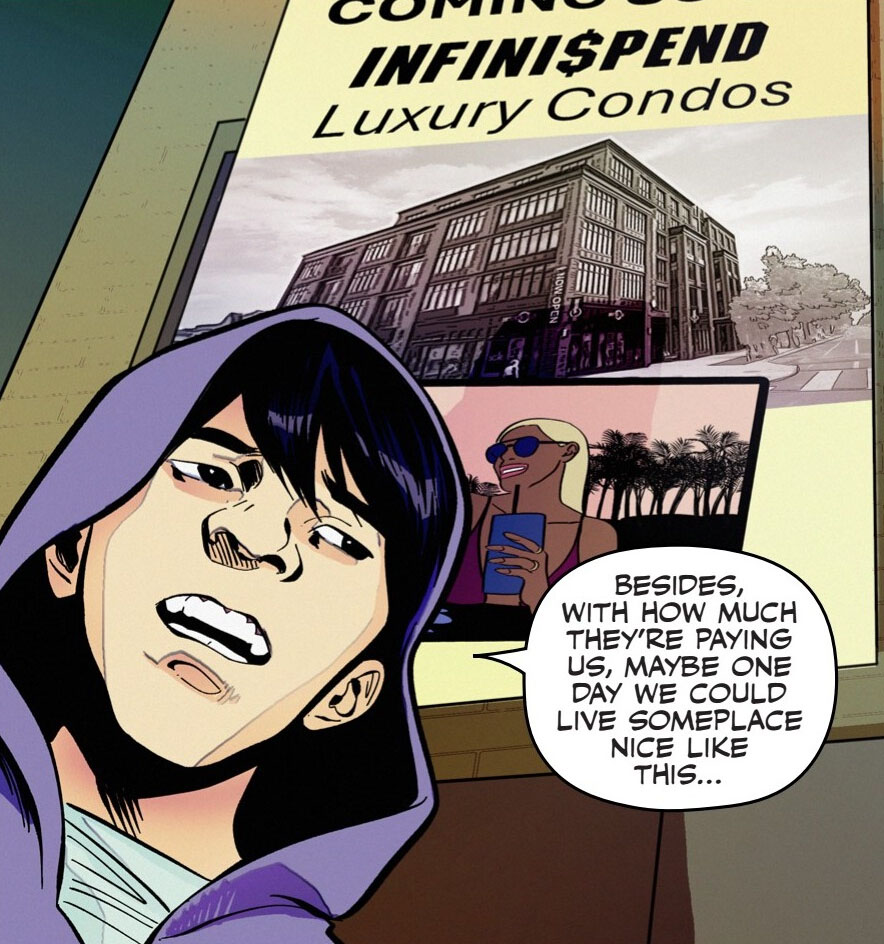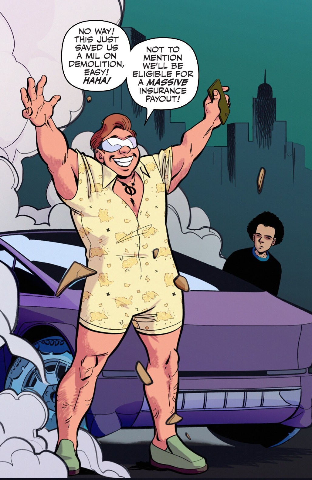 Le bâtiment s’effondrait et un nuage de poussières saisissait tout le quartier. Non loin de là, une voiture était stationnée avec à son bord l’investisseur. Celui-ci était ravi de voir son bien détruit. Cela lui épargnerait les coûts de démolitions et il toucherait probablement même une aide de l’assurance. Une aubaine ! Il réengagerait volontiers les Purple Dragons pour leur travail. Et les grenouilles étaient des héroïnes ! Une soirée très profiteuse pour lui.
