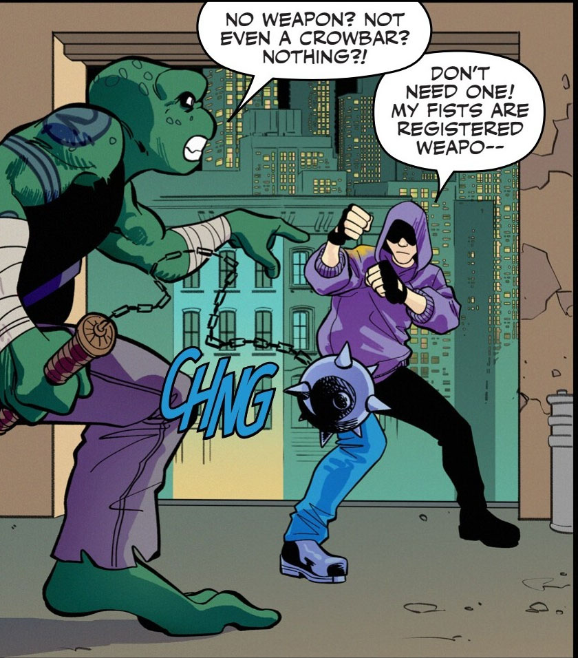 Non loin de là, trois des Punk Frogs observaient la scène. Ils étaient venus sur ce lieu avec des bombes de peinture pour refaire la décoration de l’affiche qui annonçait la construction de la nouvelle résidence. Histoire de provoquer un petit peu l’aménageur. Entendant les idées toujours à l’encontre des mutants, ils décidaient d’en remettre une couche et sautaient sur les Purple Dragons. Les trois individus reconnaissaient les batraciens et avaient bien l’intention de prendre leur revanche. Casey Jones n’était plus là pour les défendre (The Armageddon Game – The alliance #2) ! Napoleon, Attila et Genghis avaient fort à faire, mais ne tardaient pas à prendre le dessus à l’aide de leurs armes et de leur agilité.