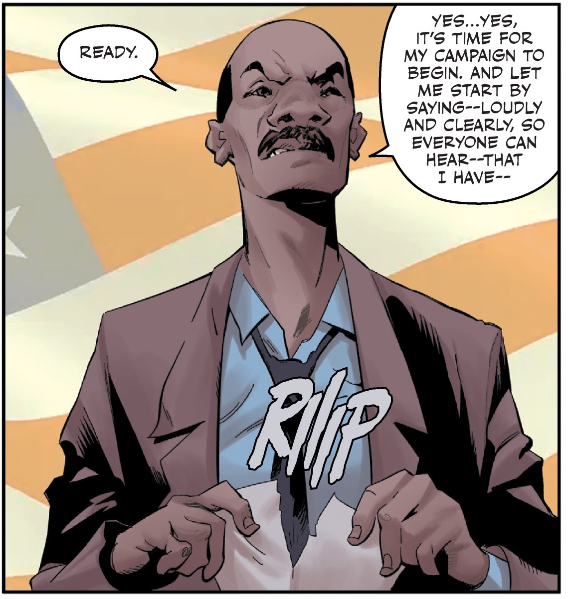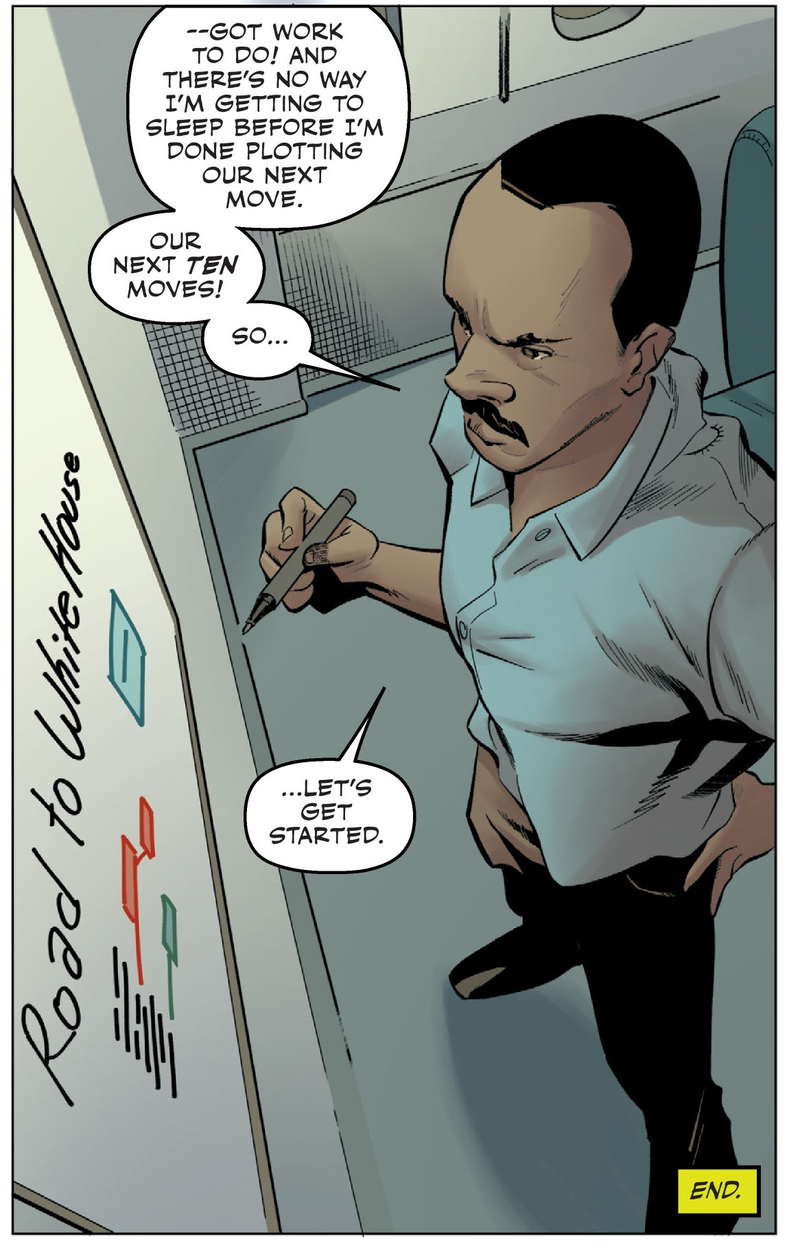 Sur le tarmac, le candidat modéré s’empressait de licencier son conseiller, qui convaincu par la prestation de Stockman, acceptait qu’ils discutent d’un éventuel retour à leur stratégie initiale. Il avait déjà planifié des rencontres et des collectes de fonds. Stockman continuerait de faire des nuits blanches, mais cette fois il s’occuperait de tout comme il l’entendait. Les journaux faisaient état de son discours surprenant qui avait mobilisé l’opinion. Stockman était enfin entendu et pouvait devenir un candidat crédible. Il s’approchait de son planning et prévoyait ses prochains mouvements, tel les échecs enseignés par son père (TMNT Villains micro-series : Baxter Stockman). Le stratège était de retour et visait la Maison Blache ! Quant à Sally, elle pouvait enfin dormir tranquille.
