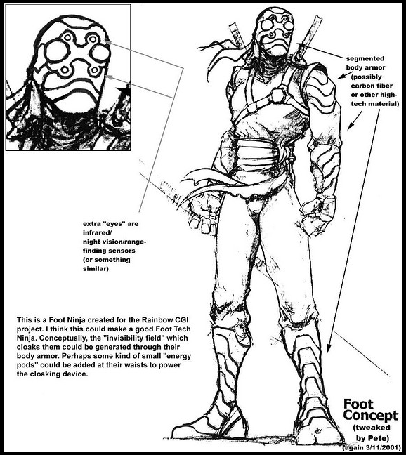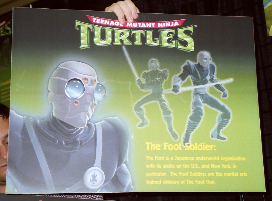 - On peut voir de nombreux points communs entre les quelques images et personnages de cette série et celle qui paru deux ans plus tard, produite par 4Kids. On peut voir par exemple Raphael arrêter Michelangelo qui s’écrit « Cowabunga »! comme dans l’épisode Mystères souterrains, part.1 (S1 E13). Mais surtout un camion ressemblant comme deux goutes d’eau à la Carapace de Combat fabriquée par Donatello, ou le témoignage de Peter Laird quant à l’inspiration des soldats Foot pour créer les ninjas Foot Tech de la série de 2003.