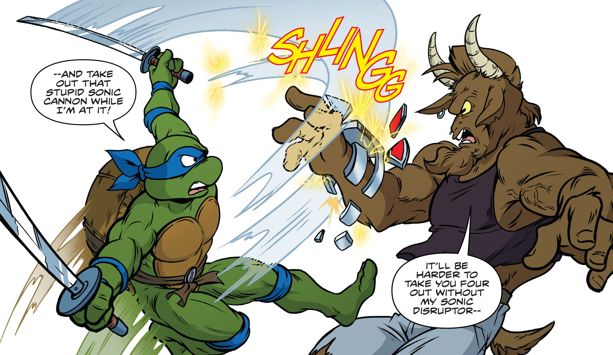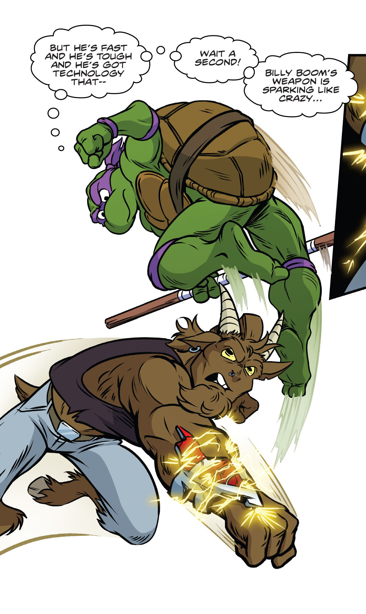 À New York, les quatre frères se battaient contre un nouveau mutant fraîchement arrivé, Billy Boom, la chèvre. Sur son poignet se trouvait un canon sonique qui donnait du fil à retordre aux ninjas. Leonardo, de son sabre, parvenait à l’endommager. Manque de chance pour les guerriers à écailles, Billy était également très adroit de sa tête et les assommait. Il ne restait bientôt plus que Donatello encore debout. Le génie cherchait à ruser. Esquivant les attaques du capriné, il voyait son appareil sonique provoquer des étincelles. Il envoyait un shuriken dessus, ce qui provoquait une surcharge et électrisait la chèvre. Billy Boom était vaincu.