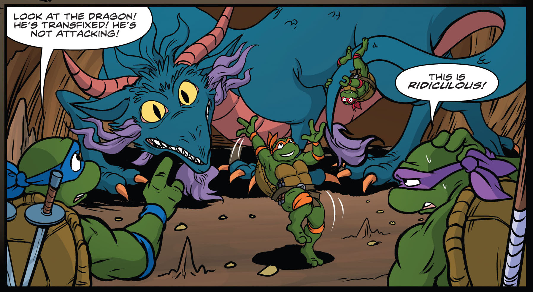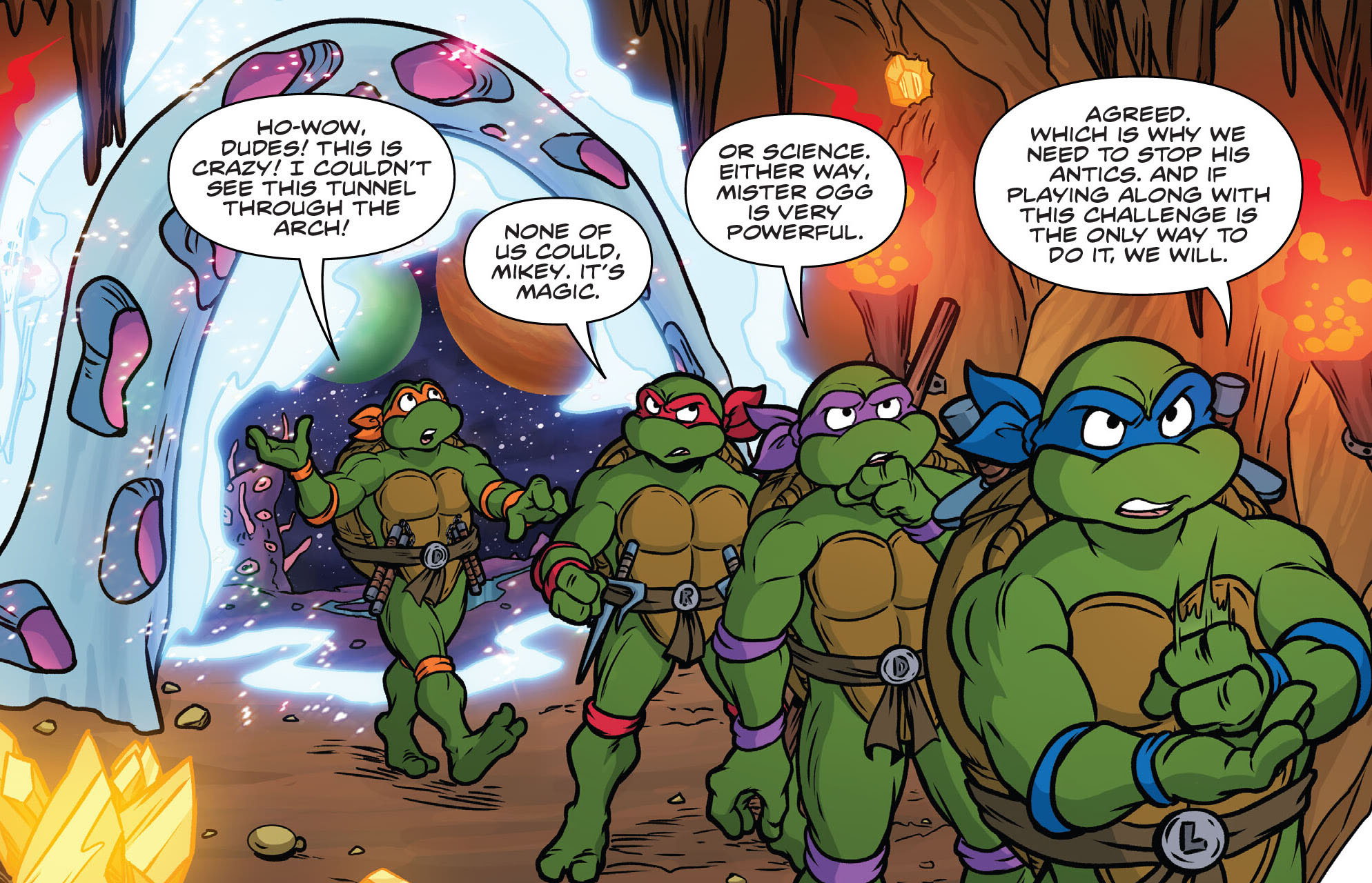Première épreuve, vaincre celui qui vivait sous l’arche que M. Ogg venait de matérialiser. Les tortues la traversaient, ce qui les amenait directement dans un tunnel. Rien de bien réjouissant. Pire encore, la porte disparaissait dans leurs dos. Des bruits et des grognements raisonnaient dans le corridor. Arrivant dans une grande cavité, les tortues voyaient leur adversaire. Un dragon géant ! Heureusement pour elles, il ne crachait pas de feu. Mais sa taille démesurée était un avantage considérable pour le monstre. Donatello réfléchissait à une stratégie. Le seul moyen de venir à bout de