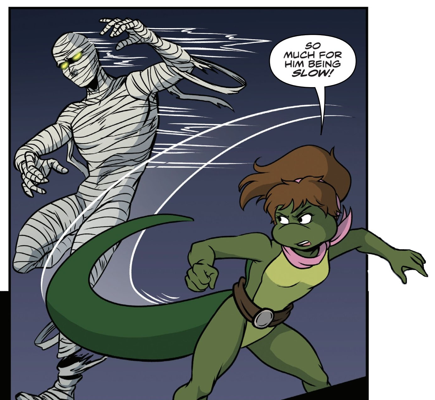 Peu de temps après son arrivée au musée, Raphael voyait quelqu’un arriver. Et pas n’importe qui ! Les deux amis faisaient face à une momie ! Sûr de lui, le ninja bondissait sur l’individu emmailloté. C’était bien connu dans les films, les momies étaient toujours très lentes et stupides ! Manque de chance, celle-ci esquivait l’attaque de la tortue. Finalement, aidé de Mona Lisa, ils parvenaient à jeter le sac de bandelettes au sol. Se relevant, la momie s’adressait à eux en anglais. Il ne pouvait laisser quelqu’un réassembler la machine de Ptah. Soudain, une nuée de bandelettes s’abattaient sur Raphael et Mona Lisa.