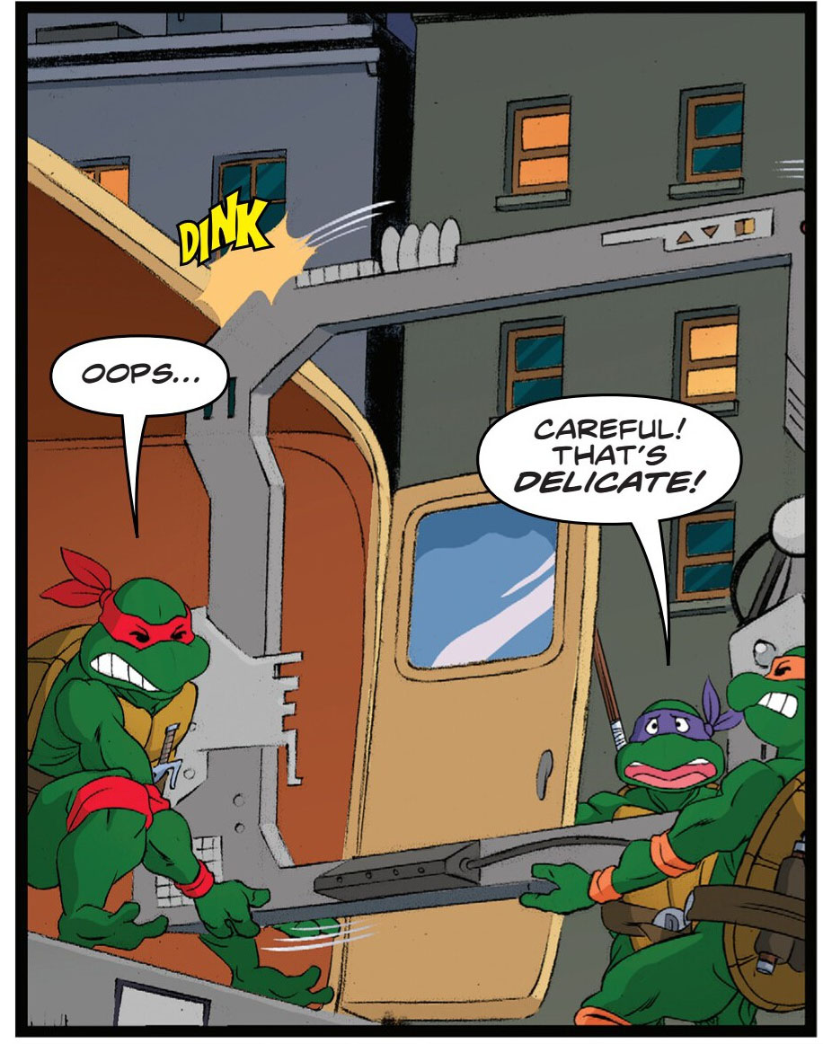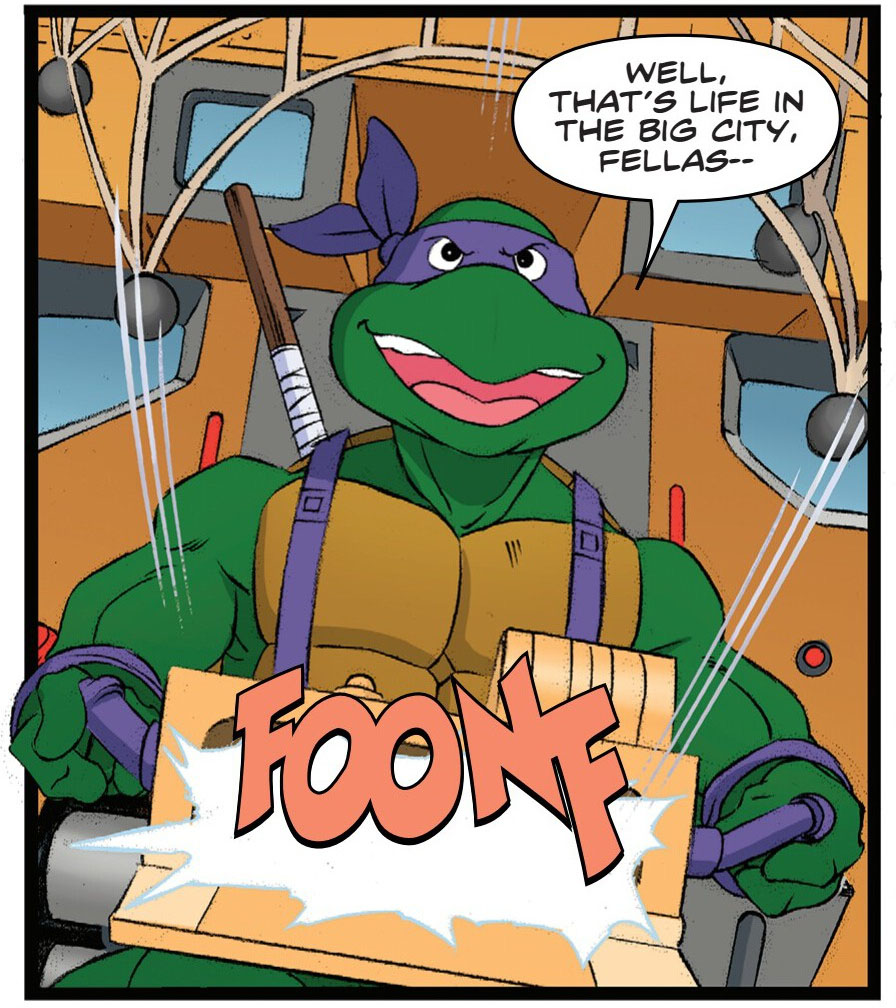 • Lorsque Michelangelo prend une poubelle en plein visage, en page 17, il se retrouve avec un journal sur la tête. Il est inscrit sur celui-ci « […] Rap […] born ». Si tout le titre n’est probablement pas montré, il s’agit d’un clin d’œil au journal que brandit Splinter à la fin du film des Tortues Ninja de 1991. Il est inscrit sur le journal « Ninja rap is born ». Il ne s’agit pas tout à fait de ça ici, mais l’individu représenté ressemble à Vanillia Ice, le chanteur du Ninja Rap.