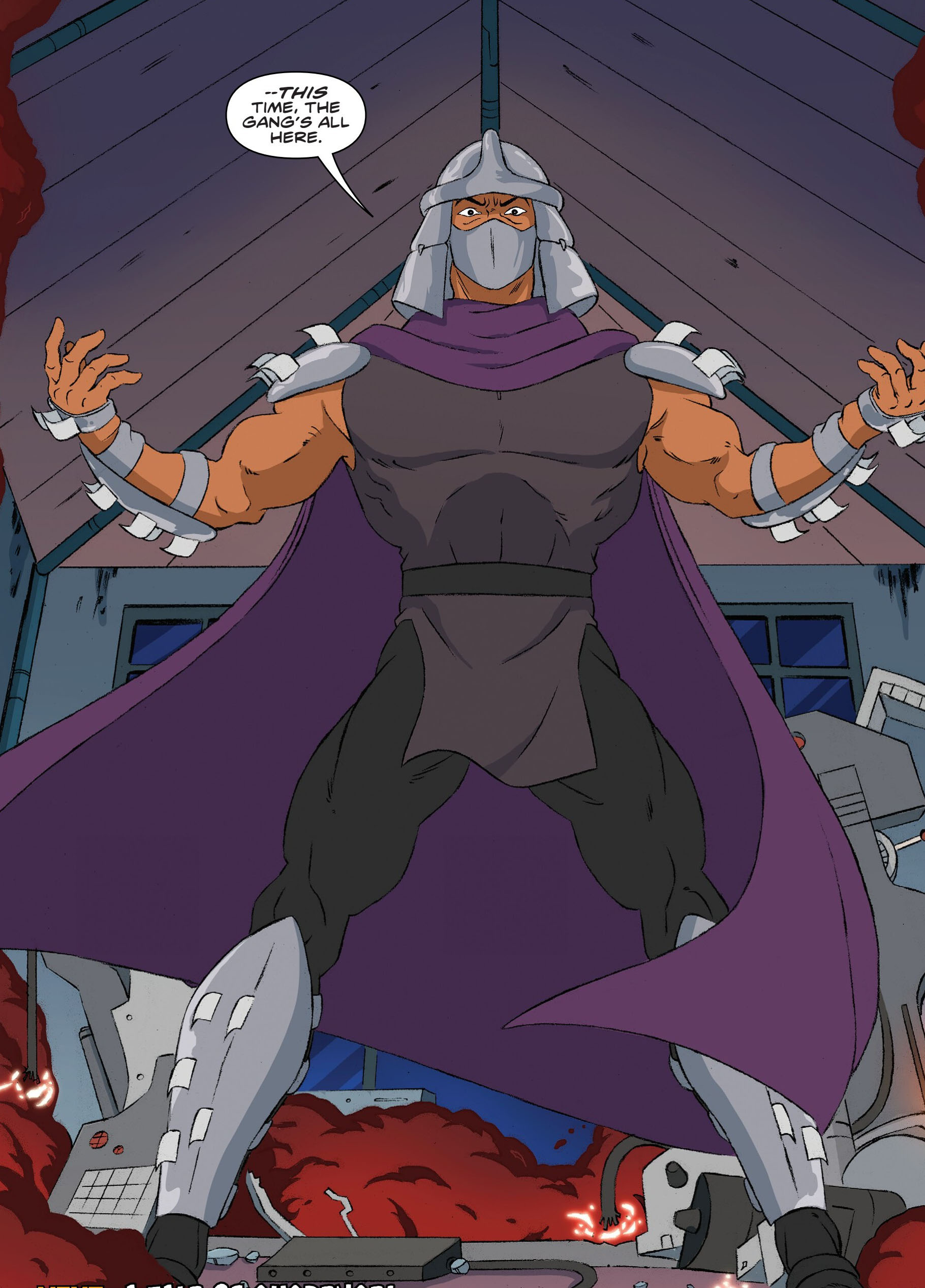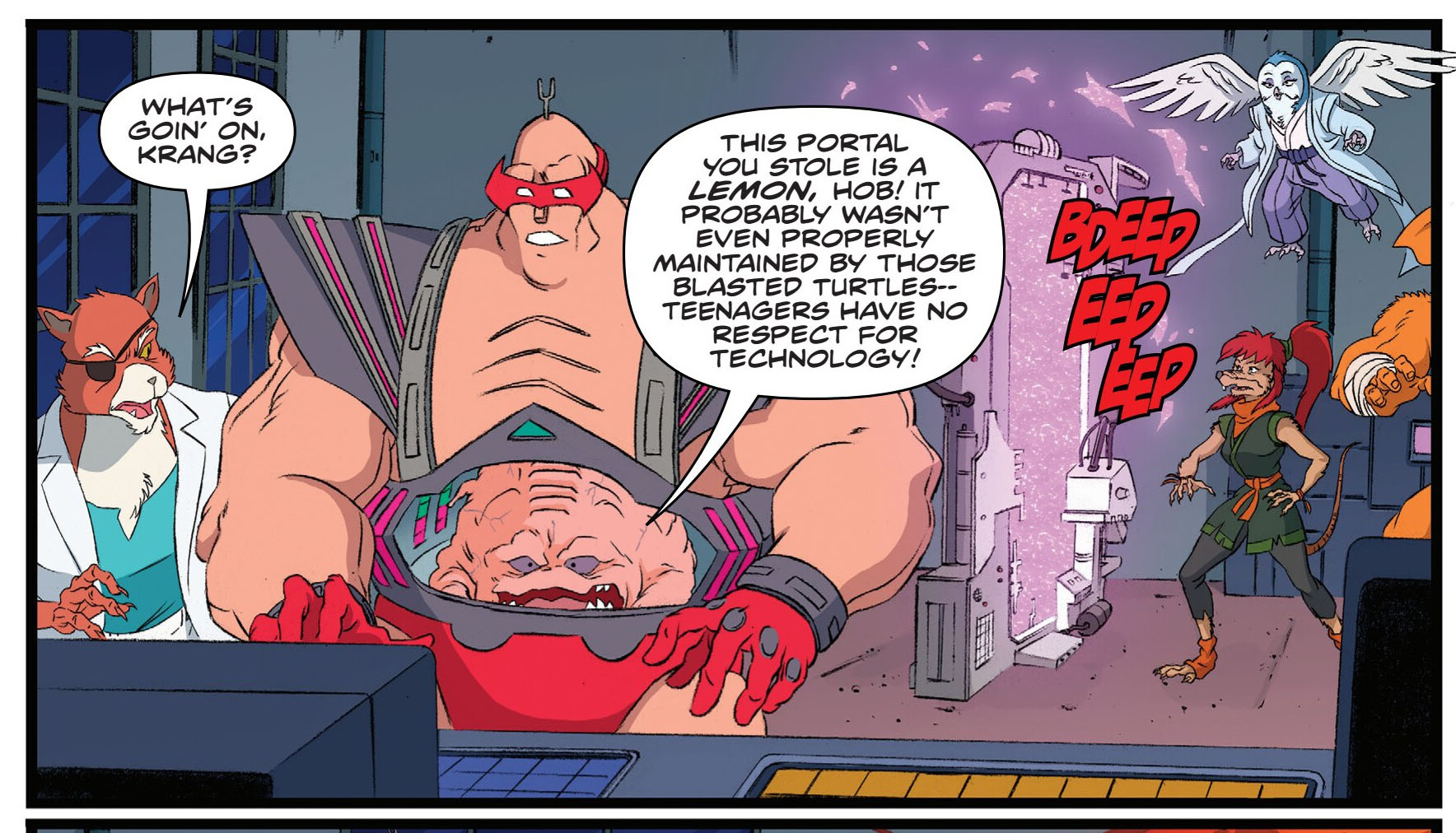 Une fois la transaction réalisée, le portail était confié à Krang. Le premier essai était concluant, tout le Panthéon arrivait dans la salle et retrouvait leur chef Old Hob. Shredder s’impatientait. Son acolyte réalisait les derniers réglages, mais un petit bruit fort inquiétant s’échappait de l’appareil. Le chat sautait sur l’extraterrestre pour l’éloigner du portail, qui explosait. Les tortues ne l’avaient probablement pas entretenu correctement. Mais si l’appareil avait explosé, contre toute attente, Shredder était bien de retour !