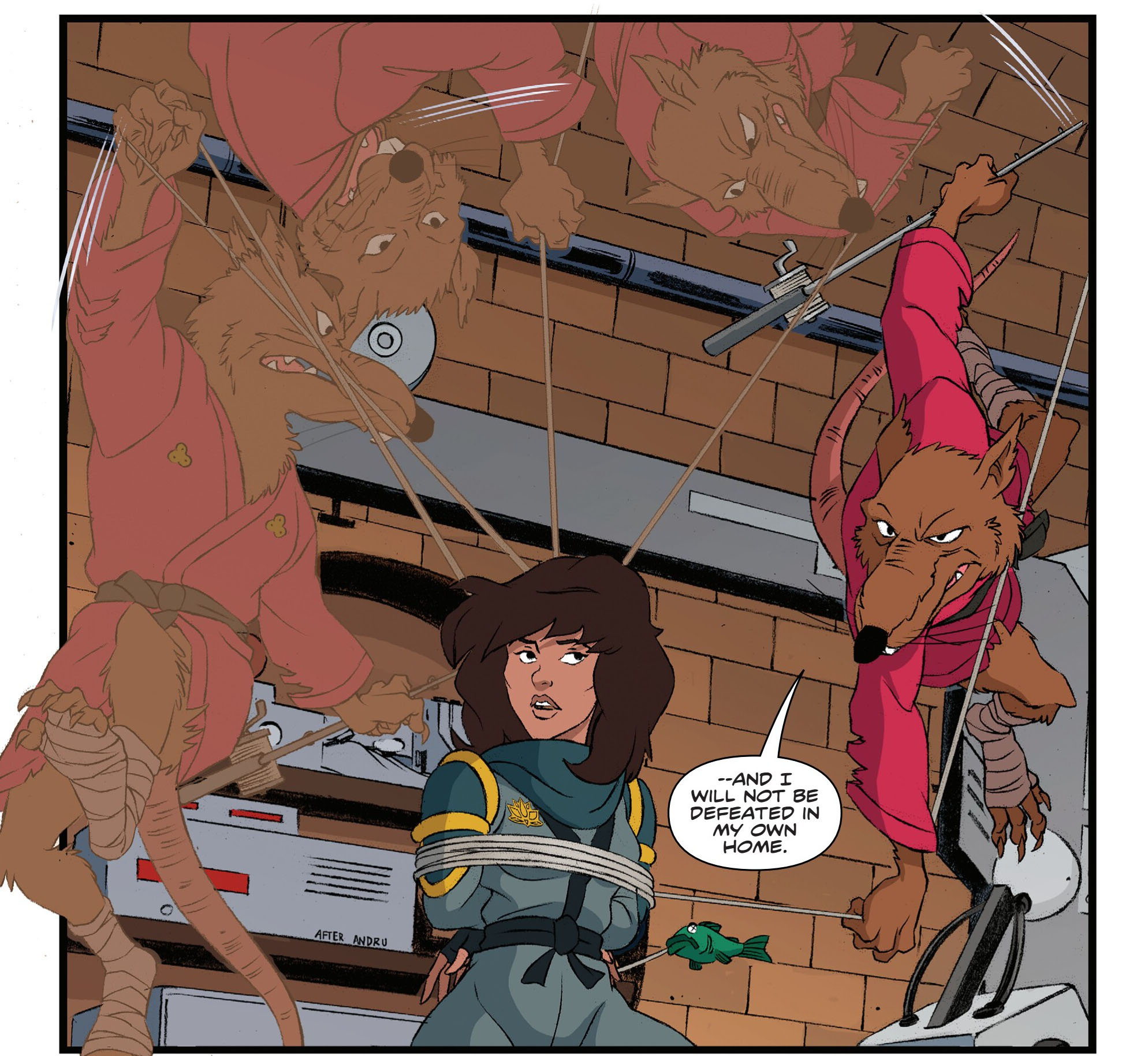 Une fois les tortues neutralisées, Lotus se demandait de quelle manière elle allait s’y prendre pour transporter le portail jusqu’à Krang. Certes il aurait été plus simple de lui donner la localisation du repaire, mais elle ne comptait pas (trop) trahir les mutants. Soudain, Splinter rentrait, plus tôt que prévu. Prise sur le fait, la jeune femme préférait attaquer le rongeur, mais celui-ci, fort de son expérience, déjouait sa prise et la liait dans le fil de sa canne à pêche. Après lui avoir expliqué la situation périlleuse, Splinter acceptait de l’aider.