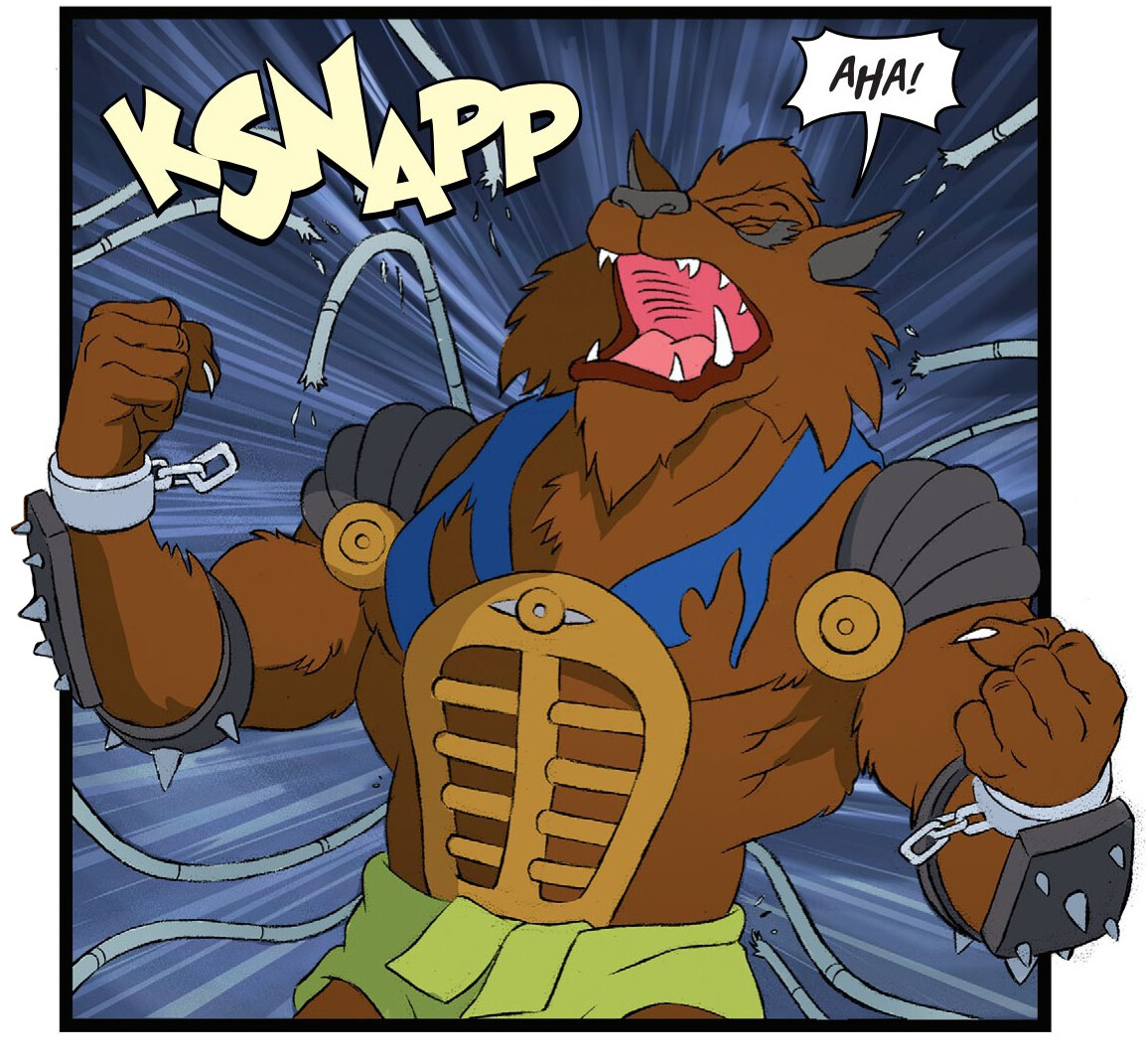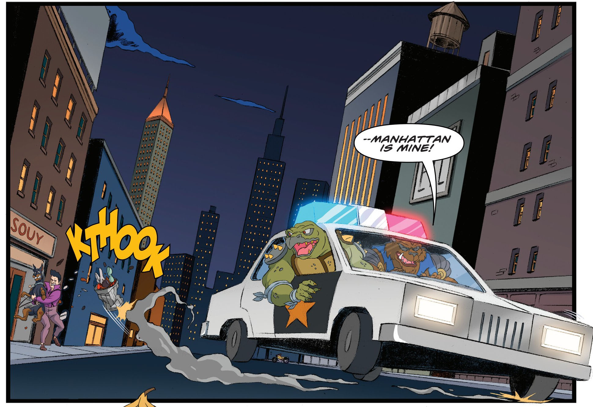 Pendant ce temps, deux policiers trouvaient et arrêtaient Tokka et Rahzar, toujours ligotés sur la voie publique. Le loup mutant se défaisait de ses liens et repoussait les forces de l’ordre avant de libérer son acolyte. Sans perdre de temps, les deux créatures montaient à bord de la voiture de police et filaient à travers la ville à vive allure.