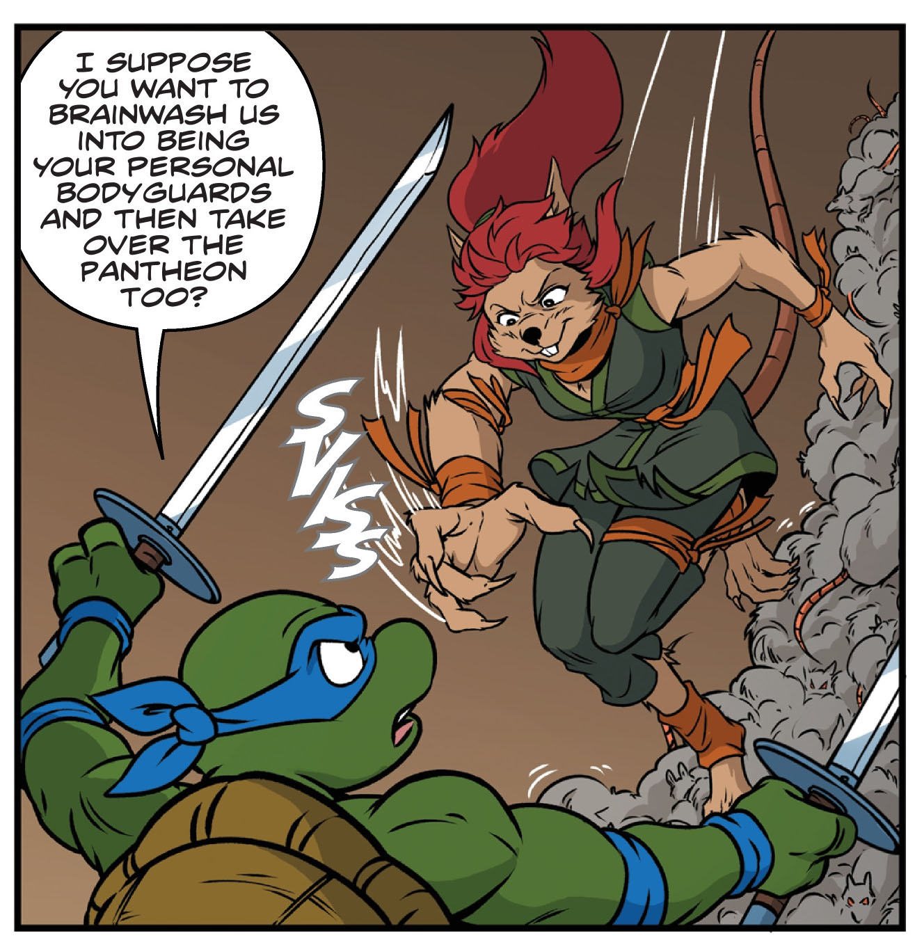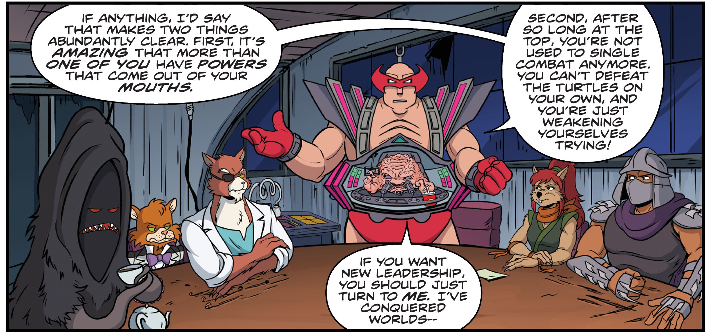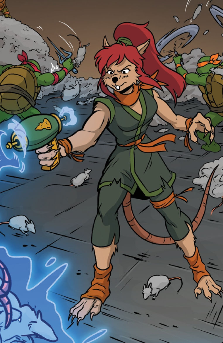 Face aux nombreux échecs du Pantheon, Krang renouvelait sa proposition de diriger le groupe de malfrats extraterrestre. Drako avait lamentablement échoué et ne parvenait même plus à cracher du feu (SMA #27). Quant à Golgotha, elle en avait perdu la voix (SMA #28) ! S’ils n’agissaient pas en équipe, ils ne parviendraient pas à vaincre les tortues. Mais la Rat Queen se dressait face à ses réclamations, certifiant être en mesure de sortir victorieuse. Elle brandissait une sorte de rayon laser entre ses pattes.