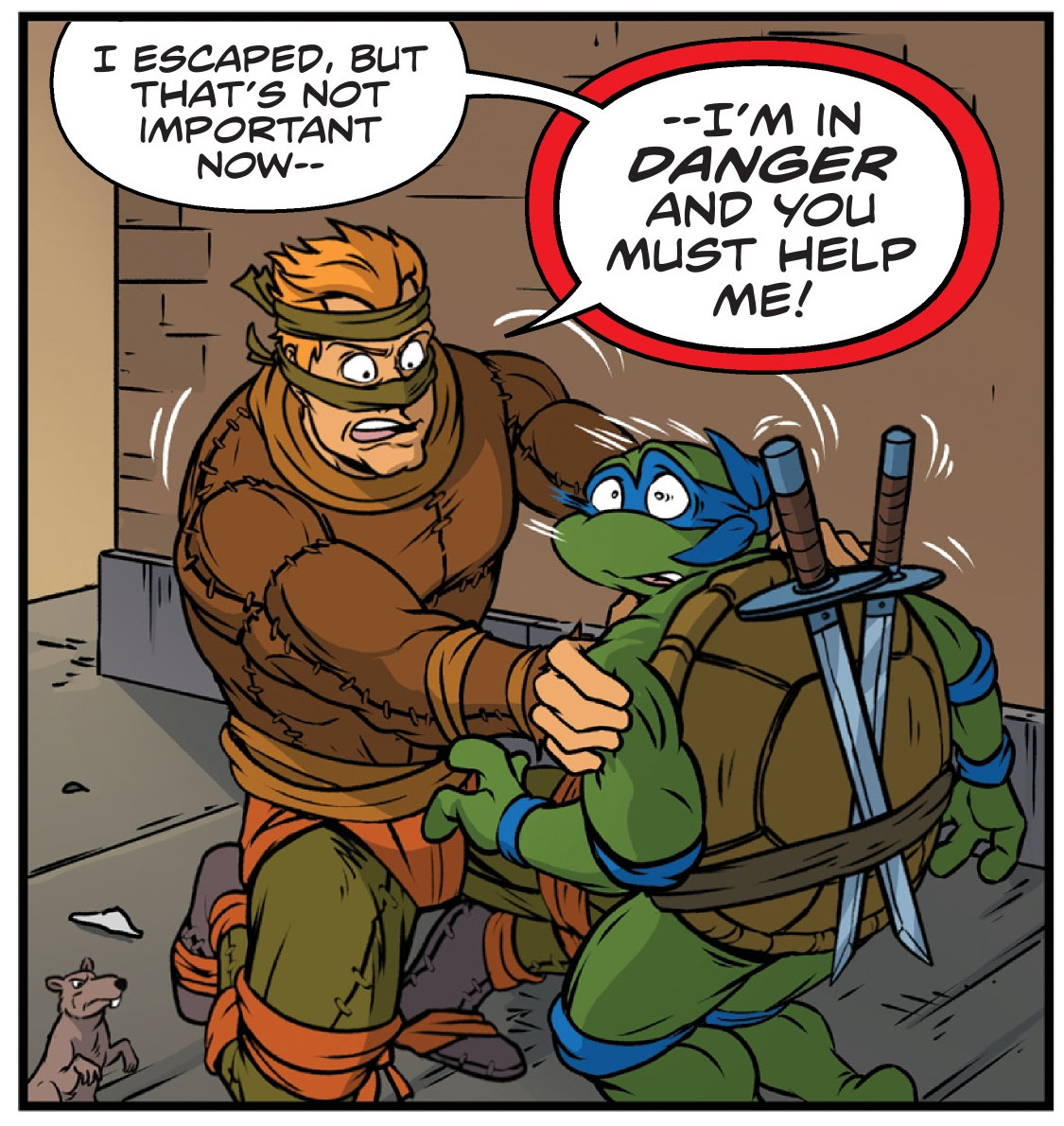 Voilà plusieurs semaines que les tortues n’avaient plus affronté d’ennemis. Ce qui ne rassurait pas Leonardo qui s’attendait au pire à tout moment. Le calme avant la tempête. Ce moment où leurs ennemis préparaient probablement un meilleur plan pour les neutraliser. C’est alors qu’il rentra de plein fouet avec le Rat King au détour d’un corridor. L’homme était apeuré et réclamait de l’aide. Une femme du nom de Rat Queen cherchait à le détruire. Michelangelo comprenait tout de suite de qui il s’agissait mais Raphael préférait rester sur ses gardes. Cela avait tout l’air d’être un piège. Hors de question pour le chef d’équipe de laisser tomber quelqu’un en danger ; même s’il s’agissait d’un de leurs plus grands ennemis.