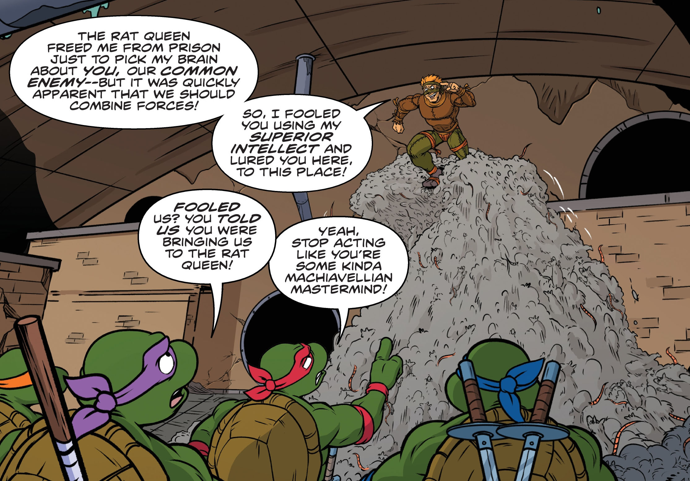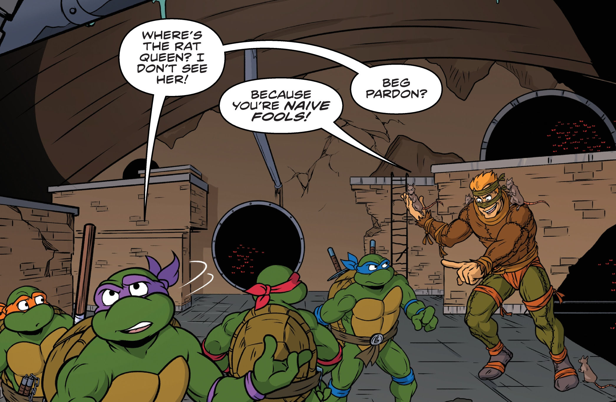 Les tortues suivaient le roi des rats à travers les égouts. Ses loyaux sujets l’avaient informé de l’endroit où se cachait la mortelle reine. Les quatre compagnons arrivaient dans un hall dégagé des égouts. C’est alors que le Rat King criait à la capture ! Il s’agissait bien d’un piège ! L’homme s’était allié à la reine des rongeurs du Pantheon pour vaincre les tortues. Elle l’avait même délivré de prison ! Soudain, une vague de rats s’élevait sous les pieds du seigneur mégalomane, le hissant de plusieurs mètres au-dessus du sol.