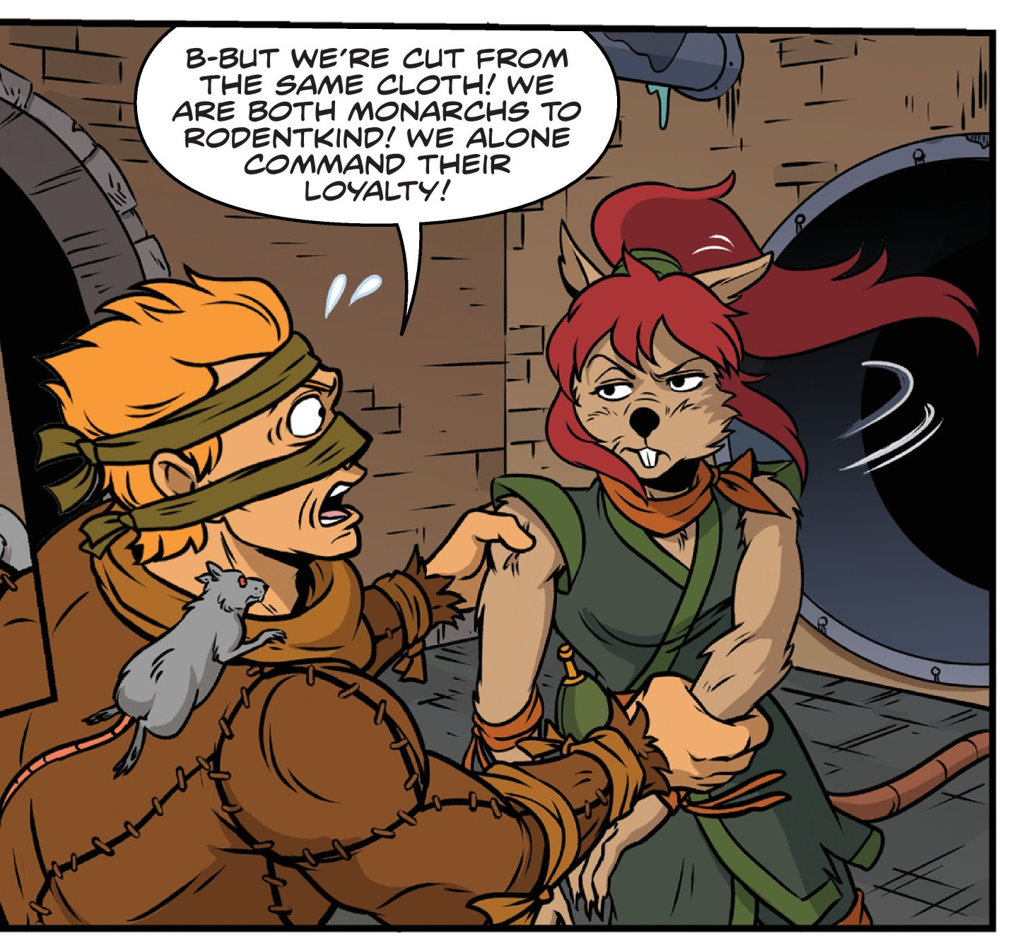 Michelangelo avait très bien compris la psychologie de ces deux mégalomanes, qui n’accepteraient jamais de partager le pouvoir, ou de montrer leurs faiblesses. Sans plus tarder, de son grappin, il subtilisait le rayon laser de la Rat Queen. Donatello s’empressait de rendre aux rats leur apparence naturelle. Puis Leonardo détruisait l’appareil. Face à ce retournement de situation, les deux seigneurs acceptaient de faire la paix et de conjuguer leurs forces. Les vagues de rats continuaient de s’abattre sur les tortues. Leonardo bondissait en direction de Michelangelo et lui demandait de l’envoyer contre leurs ennemis. La tortue rétractait sa tête et ses membres pour devenir un projectile qui jetait au sol le roi et la reine. Cette dernière gisait, inconsciente et vaincue. Quant à l’homme, il se relevait et prenait la fuite en direction d’un corridor sombre. Donatello l’assommait avant qu’il ne quitte la pièce.