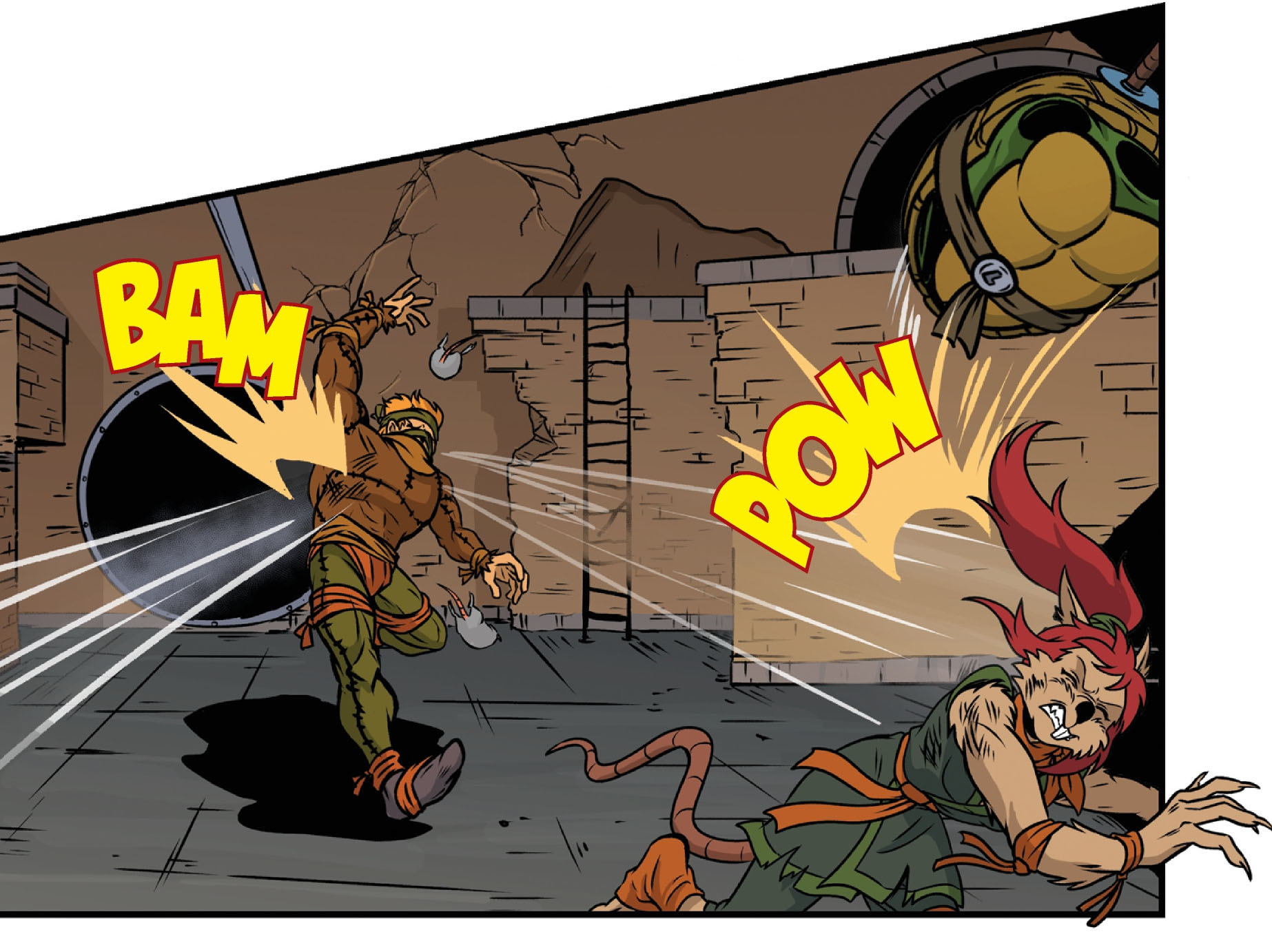 La Rat Queen se cachait non loin et sautait sur Leonardo tandis que ses frères repoussaient une déferlante de centaines de rongeurs. Les tortues étaient déjà parvenues à anéantir les desseins du Rat King et de ses sujets, il n’en serait pas autrement cette fois. C’est alors que la reine brandit son rayon laser et tira sur plusieurs rats. Ceux-ci prenaient des dimensions tout à fait remarquables. Raphael les comparait à Splinter, l’habilité au combat en moins ! Les tortues avaient besoin d’un plan au plus vite. Face à l’assaut et à la situation relativement désespérée, pas même Leonardo n’avait pas d’idée.