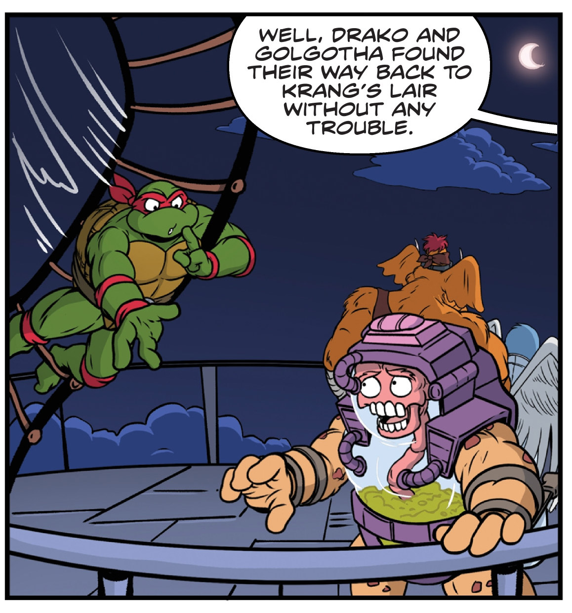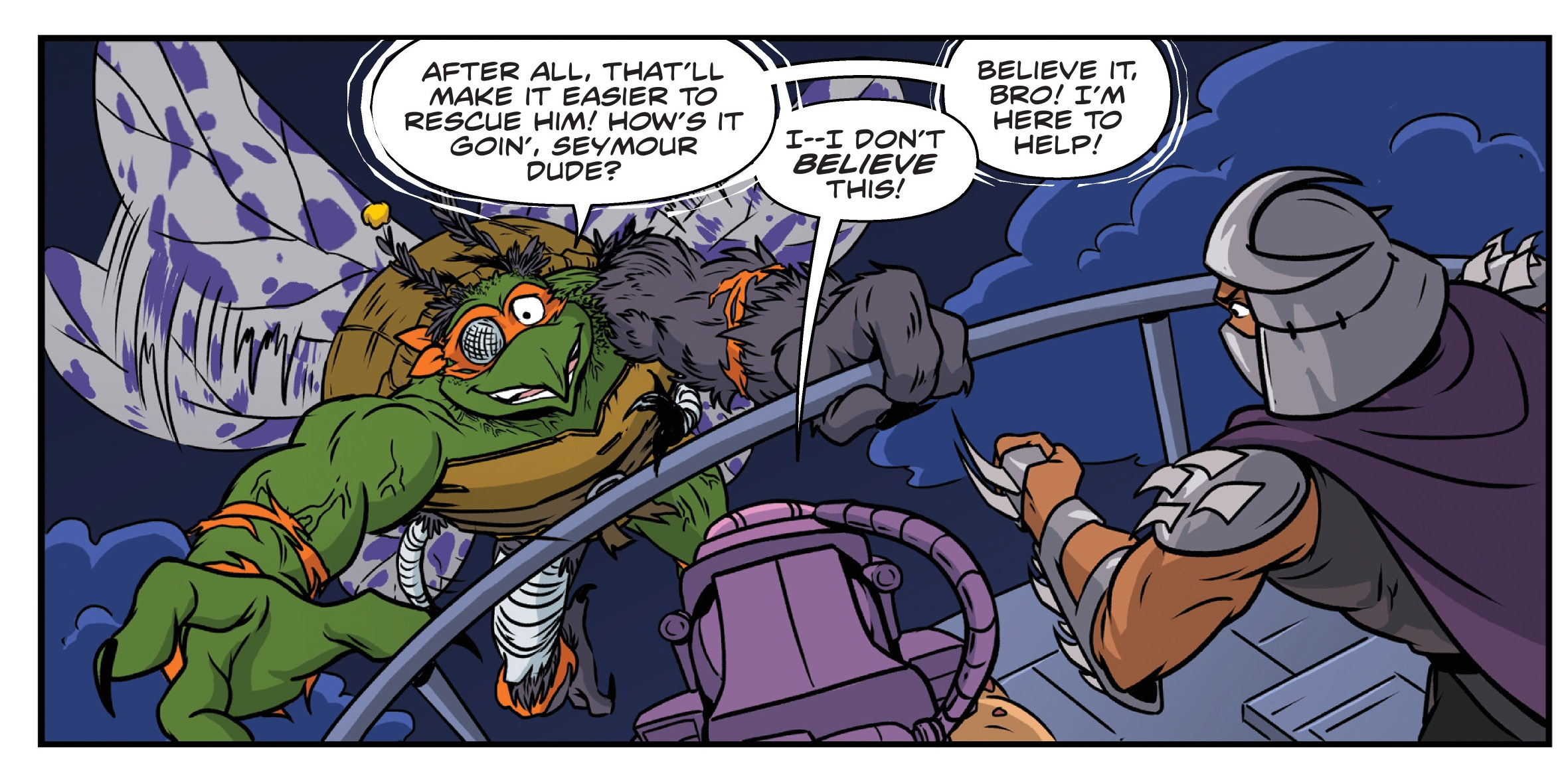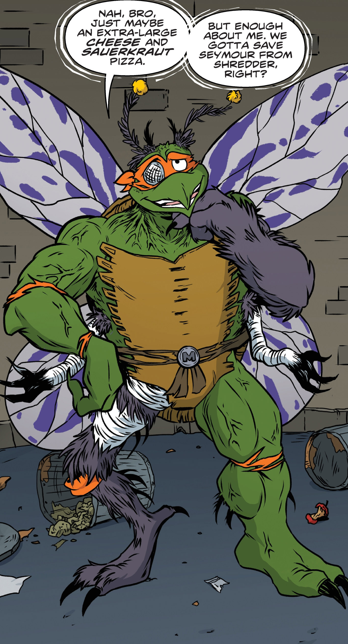 Les tortues, et Donatello en particulier, n’en revenaient pas de la transformation de leur frère. Michelangelo était littéralement devenu un mutant mi-tortue mi-mouche. Mais malgré son changement d’apparence, l’adolescent avait l’air de bien se porter et avait même envie d’une pizza ! Mais le génie de l’équipe craignait que Shredder soit hors de portée, le temps d’atteindre leur dirigeable. Pas de problème pour Michelangelo, qui se servait de ses ailes d’insecte pour voler en direction de la plateforme volante de leur ennemi.