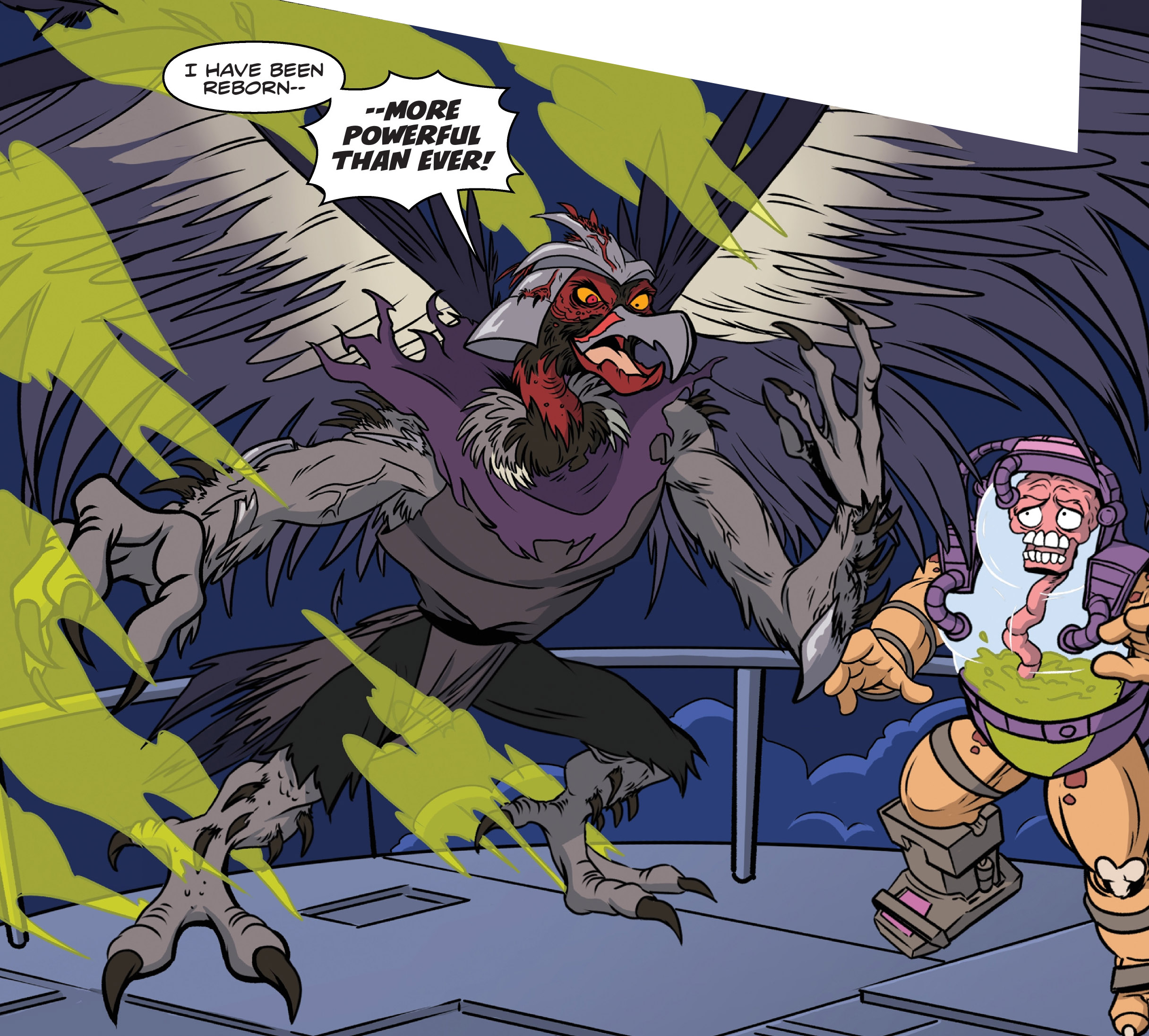 - Même l’armure de Shredder possède des plumes une fois transformé ! Ce n’est pourtant que du métal, rien d’organique. Ce n’est pas la première fois que ce type d’incohérence arrive, puisqu’on pouvait déjà voir une modification de son armure en tant que Super Shredder dans le film de 1991 et dans le dessin animé de 2012.