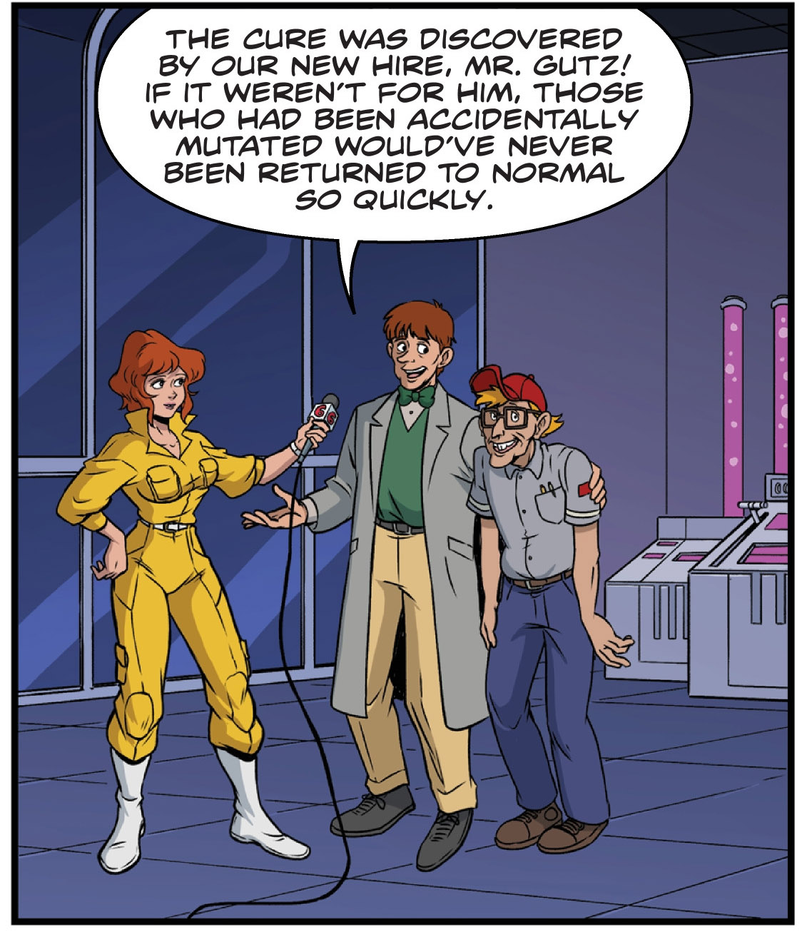 April couvrait l’évènement directement depuis le T.C.R.I. et interviewait le professeur McGuffin. Celui-ci attribuait la victoire à un de ses nouveaux employés, Seymour Gutz. Raphael était agacé qu’on ne leur attribue jamais une victoire aux informations. Mais cela valait mieux, comme toujours. Le seul à ne pas retrouver tout à fait son compte était Seymour lui-même. Le rayon avait neutralisé sa mutation, terriblement instable. Il avait recouvré son apparence humaine initiale. Qu’allait donc dire sa mère, en voyant l’affreux fils redevenu celui qu’il était ? Il préférait celle du charmant gentleman qu’il avait adopté depuis sa transformation. Mais pour Donatello, ce changement allait surtout pouvoir aider la recherche, notamment dans la lutte contre les mutations comme le cancer.