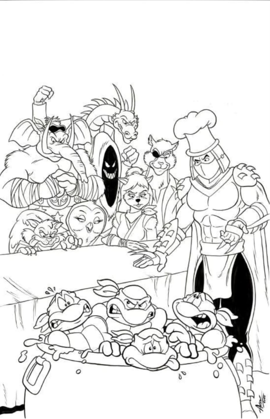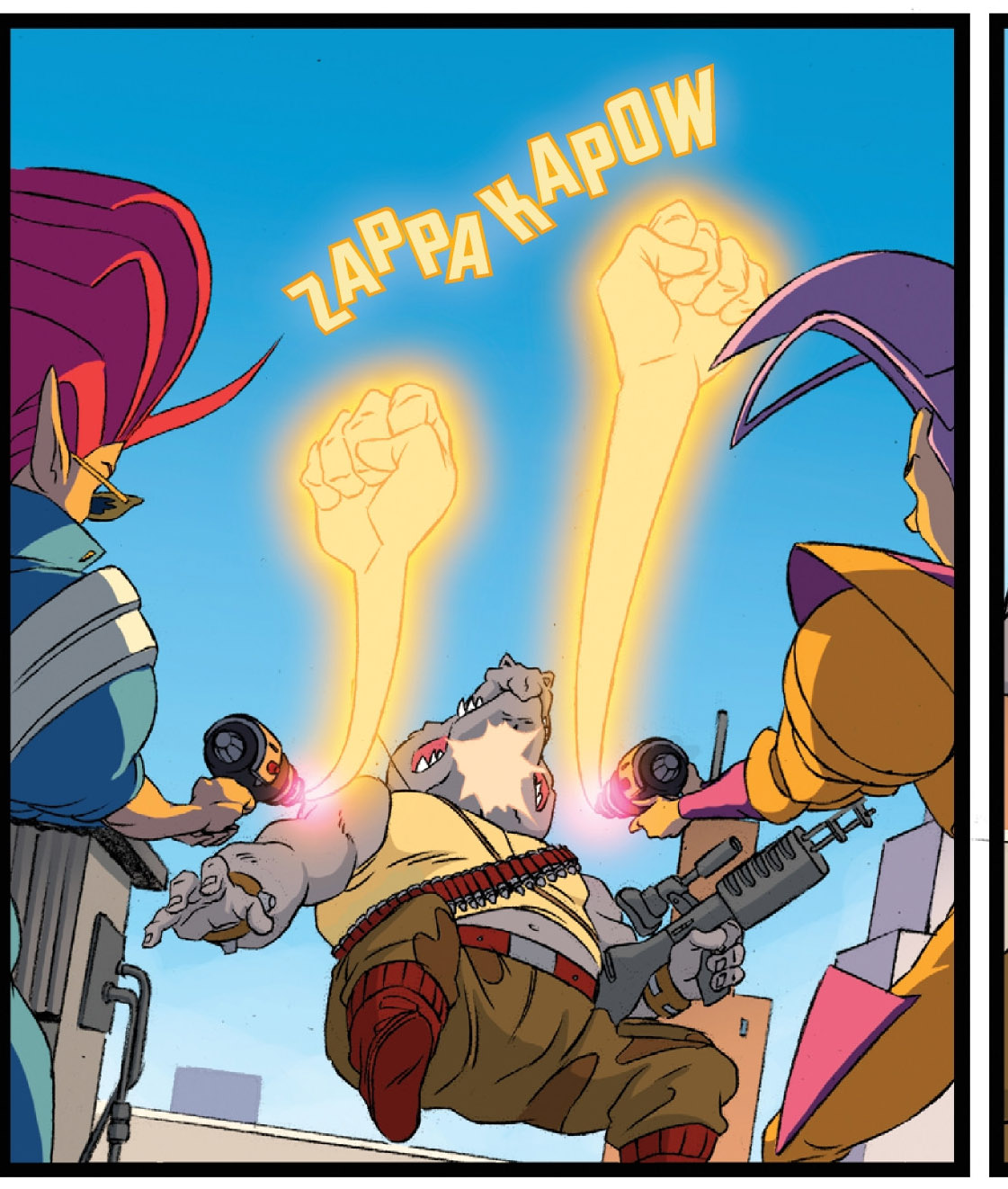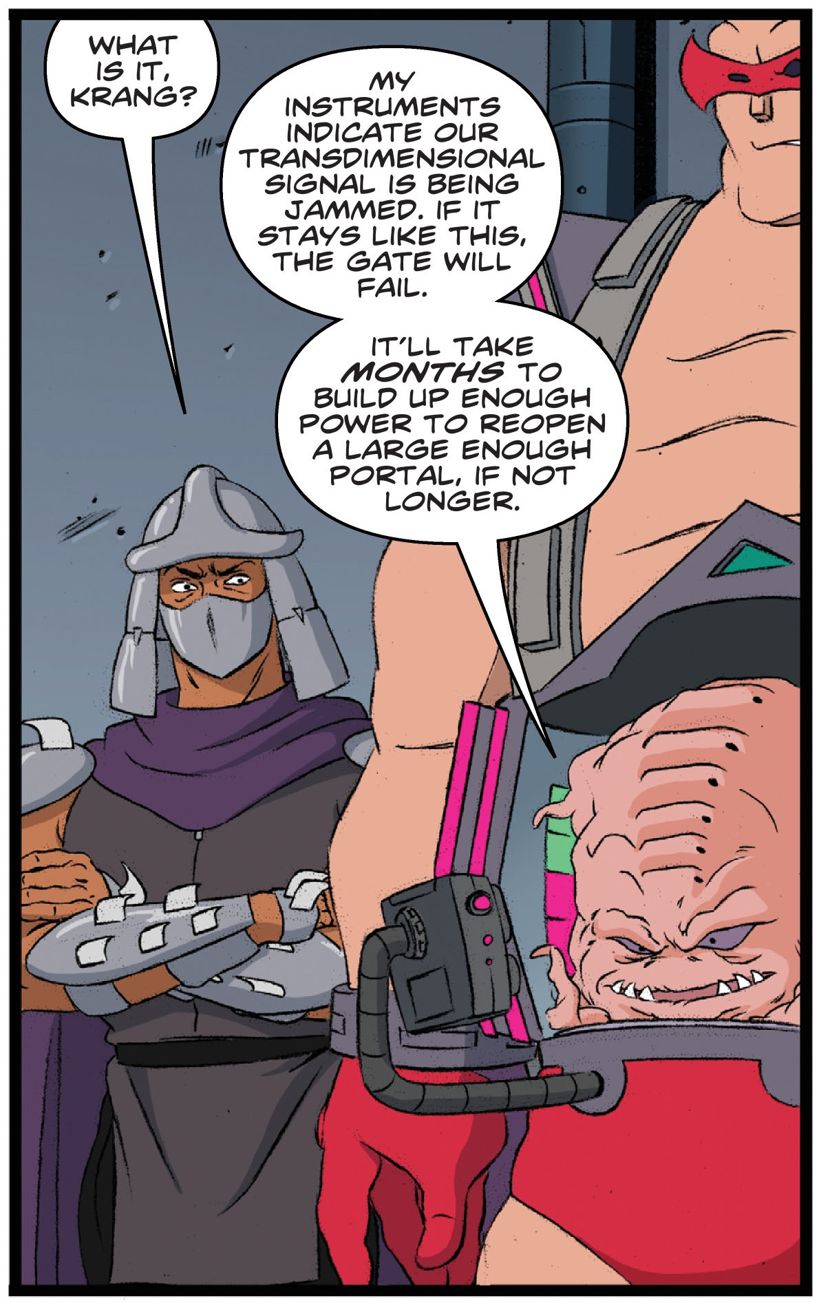 Pendant ce temps, Old Hob tenait un discours d’attaque à son groupe du Pantheon, ainsi qu’à Shredder et Krang. Leur plan était fin prêt, leur générateur à portail interdimensionnel pouvait faire apparaître leur forteresse mobile pour conquérir la Terre. Mais Drako ne l’entendait pas de cette oreille. Pour lui, seule la vengeance contre les tortues comptait. Le chat le rabrouait sans mal. Après avoir fait venir leur base sur Terre, ils pourraient en finir avec leurs ennemis quand bon leur semblerait. Shredder et Krang allaient dans ce sens, d’autant que ce dernier sentait enfin une proche victoire. Il se rendait bien compte que la forteresse était plus puissante même que son propre Technodrome ! Soudain, ses capteurs détectèrent quelque chose en train de neutraliser leur travail.